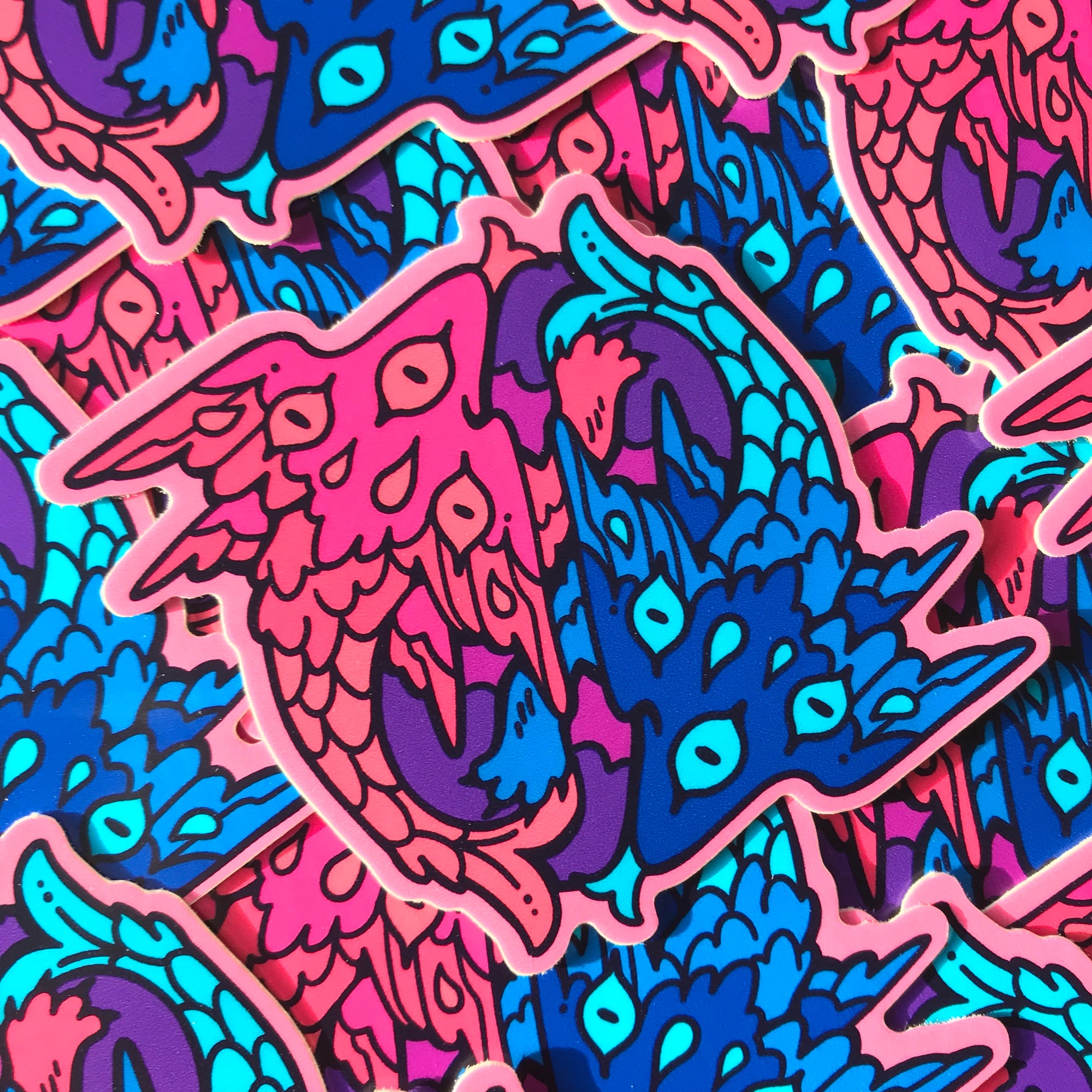 A pair of fish-tailed angels, for Bisexual pride. This sticker is approximately 3 inches (7.6 cm) on the longest side, and printed on matte vinyl.