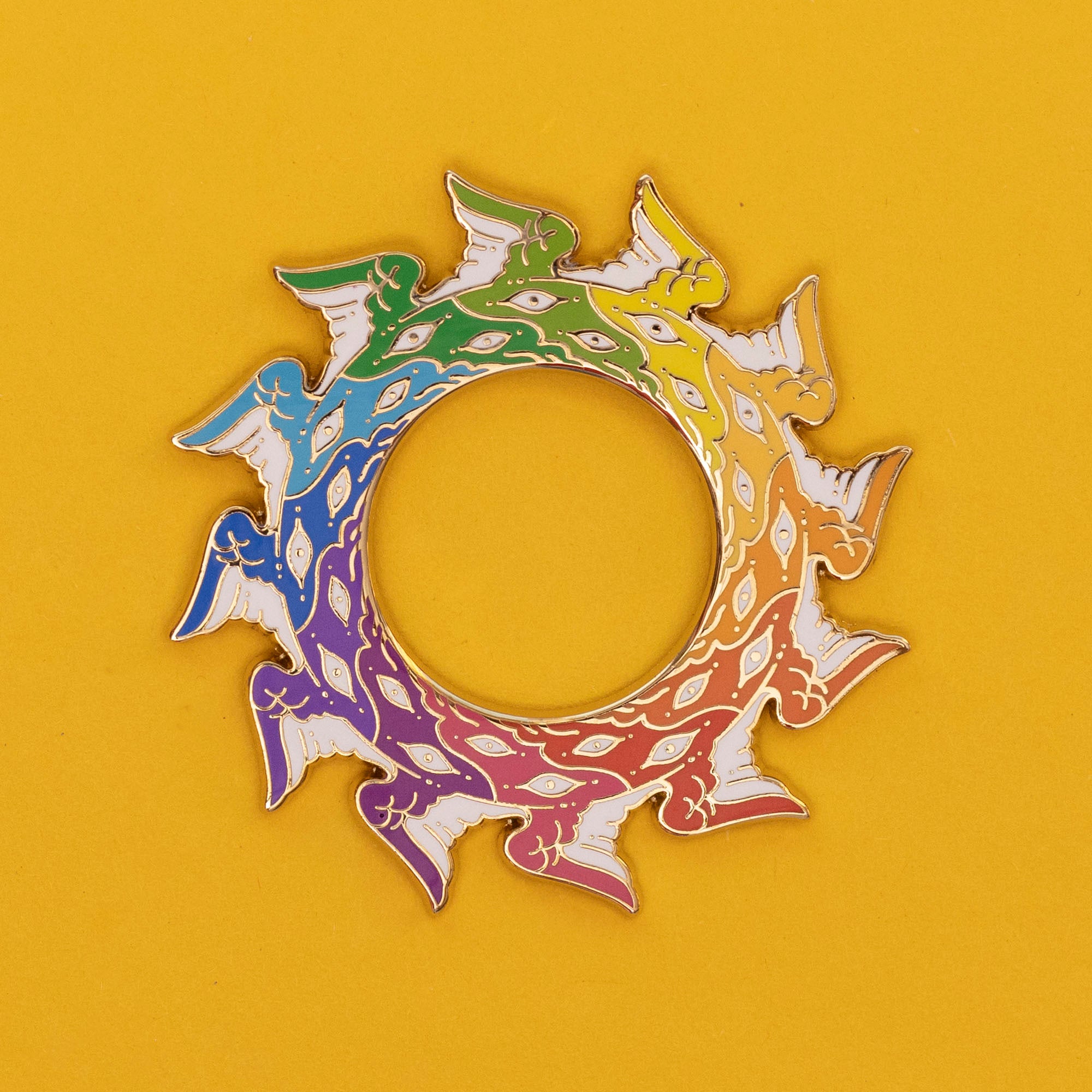 An eyewheel with all the hues of the rainbow. This pin has hard enamel, gold plating, two pin posts, and rubber backings. It is about 2 in (5 cm) wide.