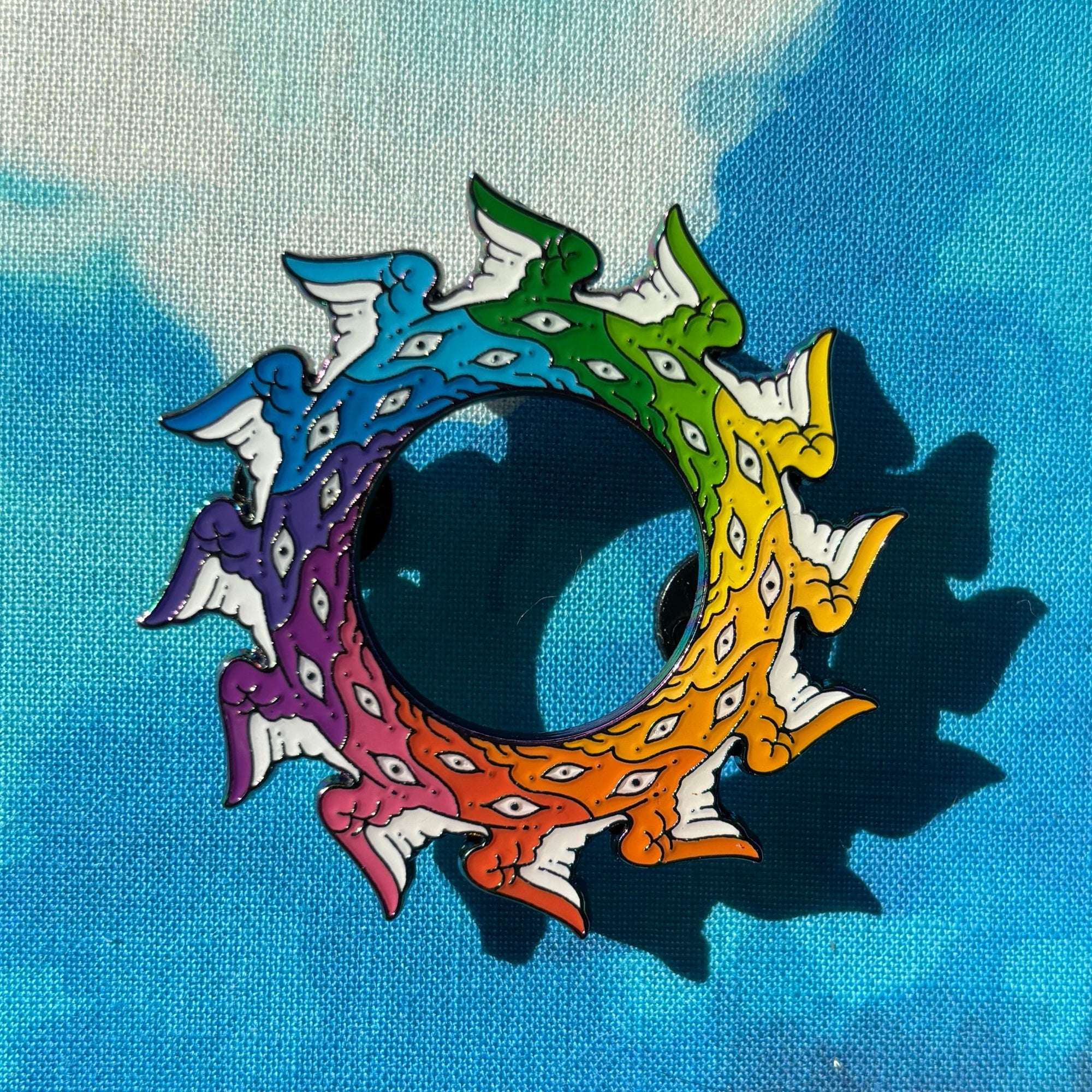 | An eyewheel with all the hues of the rainbow. This pin has soft enamel with epoxy, rainbow plating, two pin posts, and rubber backings. It is about 2 in (5 cm) wide. This listing is for standard grade pins only. Standard grade pins may have one or two tiny imperfections. Rainbow plating colors may vary from listing photos. |