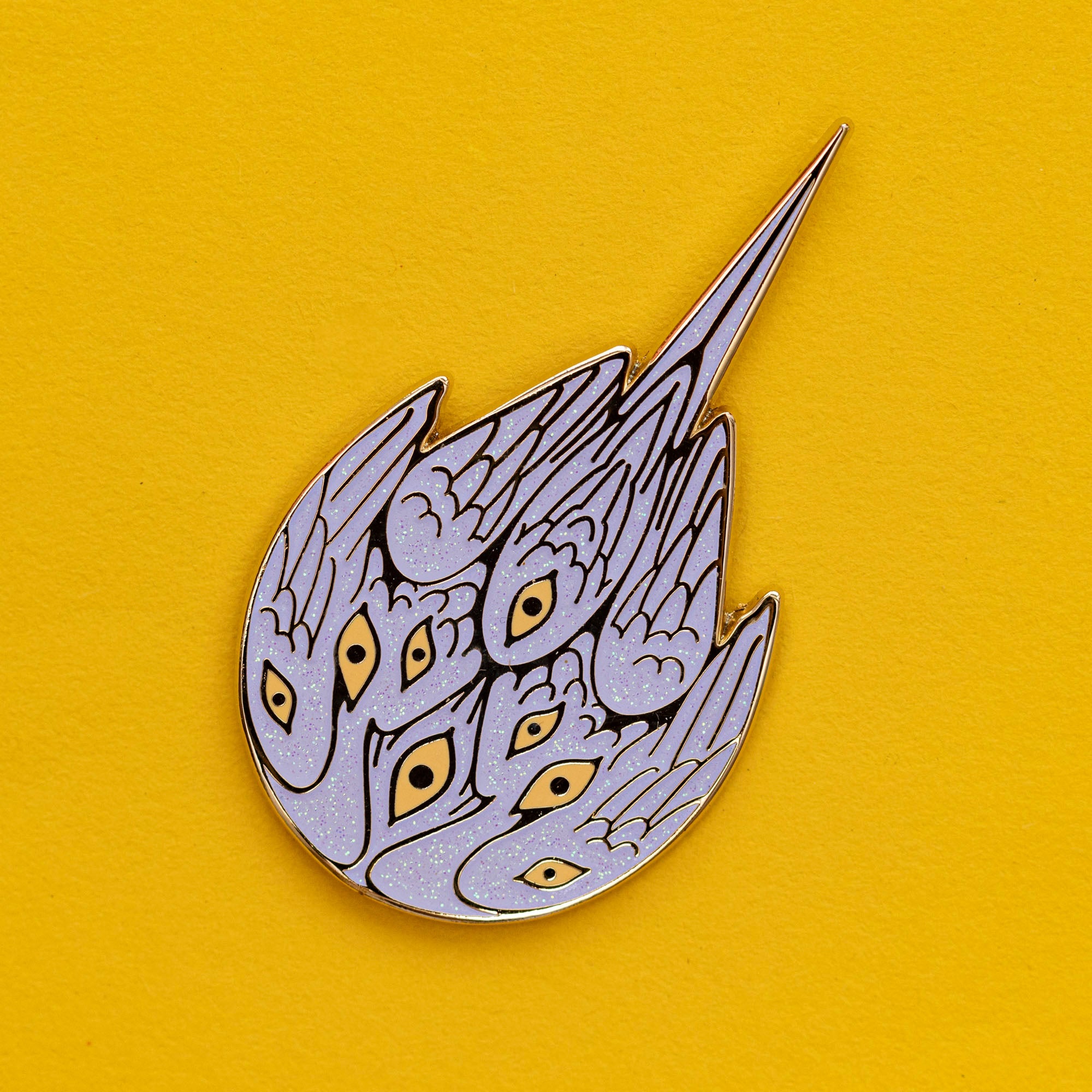 This pin is approximately 1 in (2.5 cm) wide. The pin has hard enamel and two pin posts with rubber clutches. It is available with blue enamel with silver plating; or glitter enamel with gold plating.