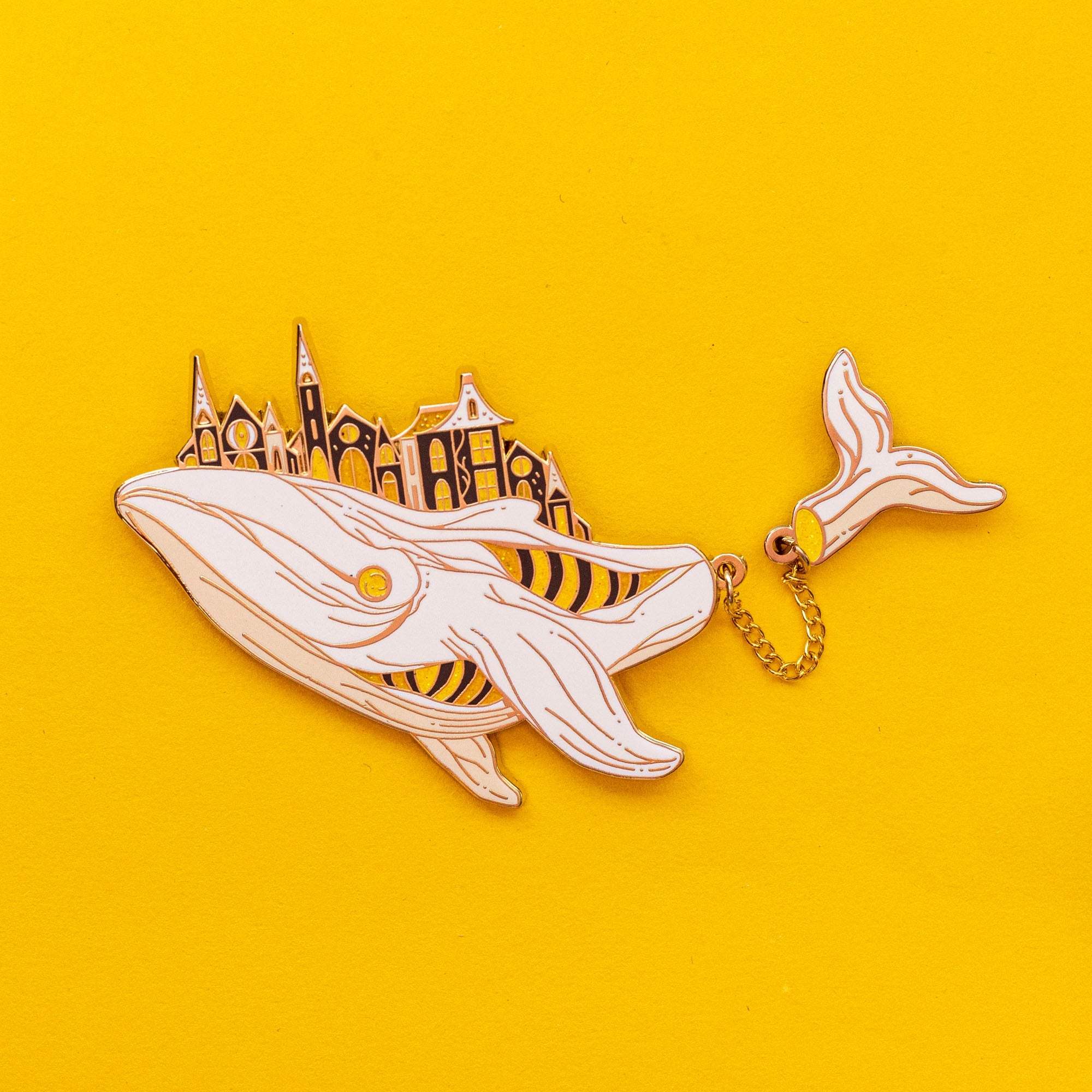 The pin consists of two parts, connected by a chain. The whale body is approximately 2.5 inches (6 cm) long, while the tail is about an inch long (2.5 cm). The pin has hard enamel, gold plating, and recessed metal detailing. It has two pinbacks with rubber clutches on the whale body, and one pinback on the tail.