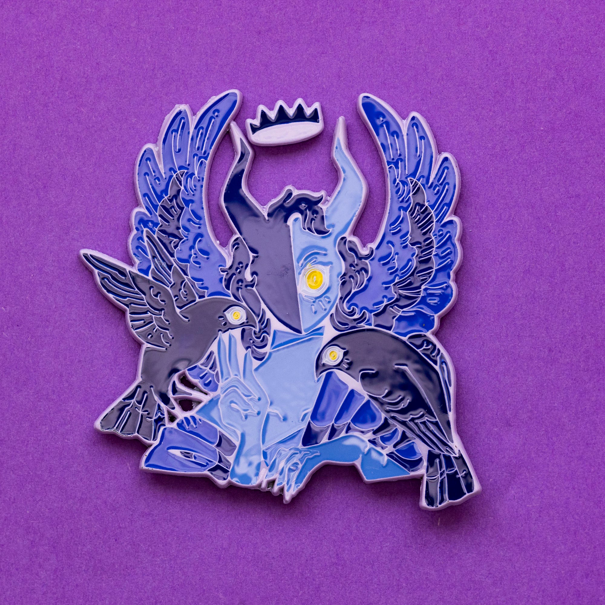 Naberius is available in indigo soft enamel with dyed metal and epoxy; or gray hard enamel with gold plating.