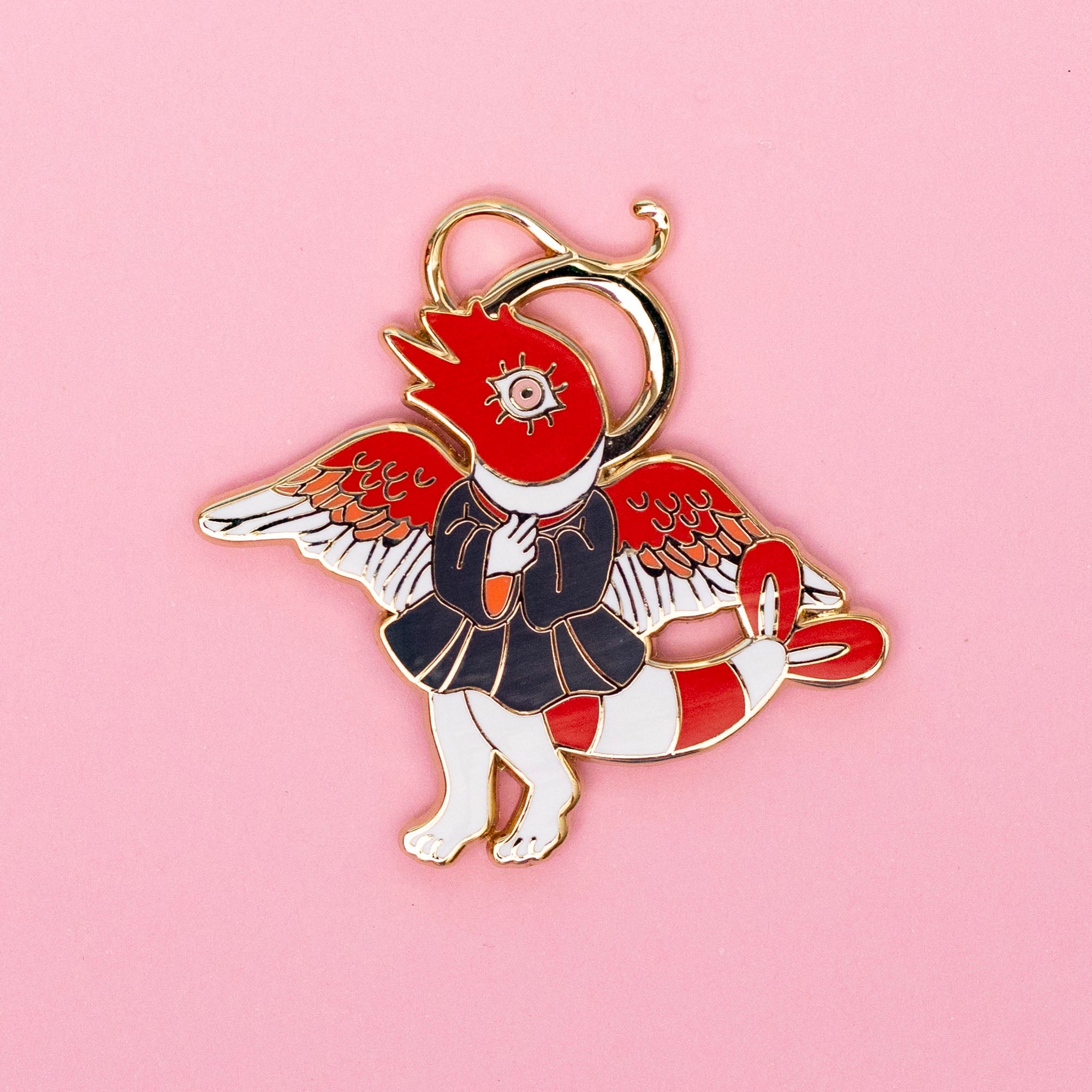 This pin is inspired by a comedic bit from one of my favorite podcasts, “My Brother, My Brother, and Me.” Shrimp Angel has a gold halo and a stripey tail.