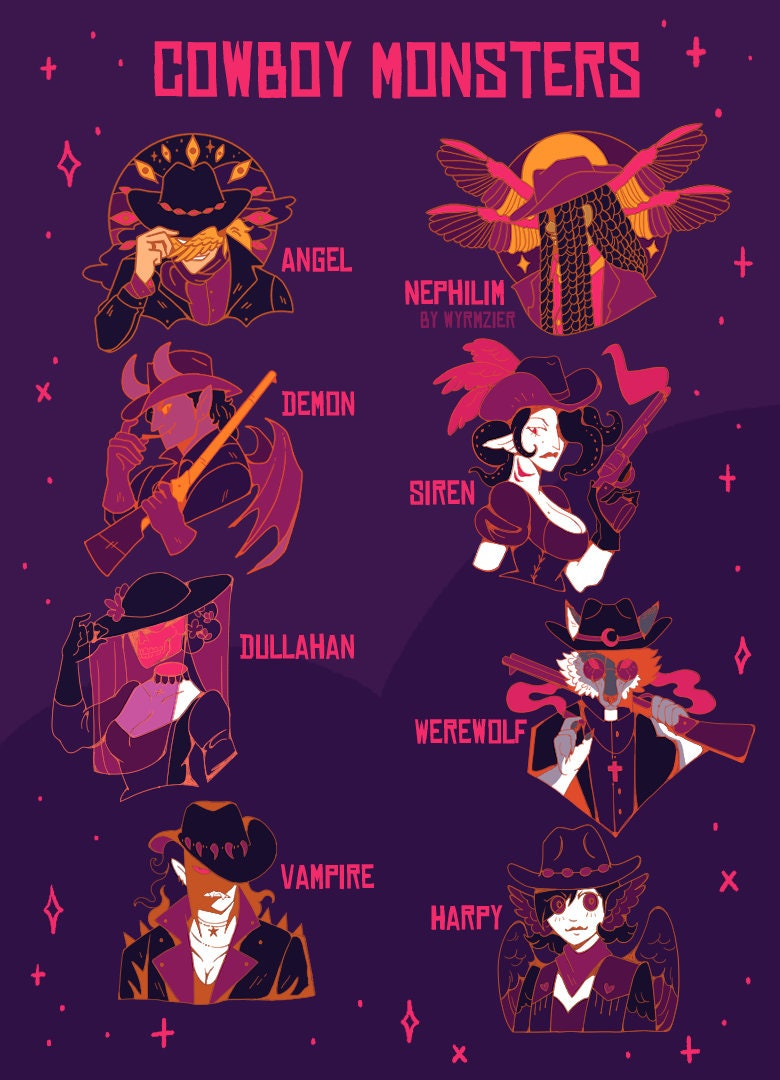 | A mini series of my original characters as cowboys! Each pin has copper plating, hard enamel, two pin posts, pink glow accents, and rubber backings. Please note that some tarnish on copper plating is to be expected, and you can remove it by gently using a jewelry polishing cloth. |