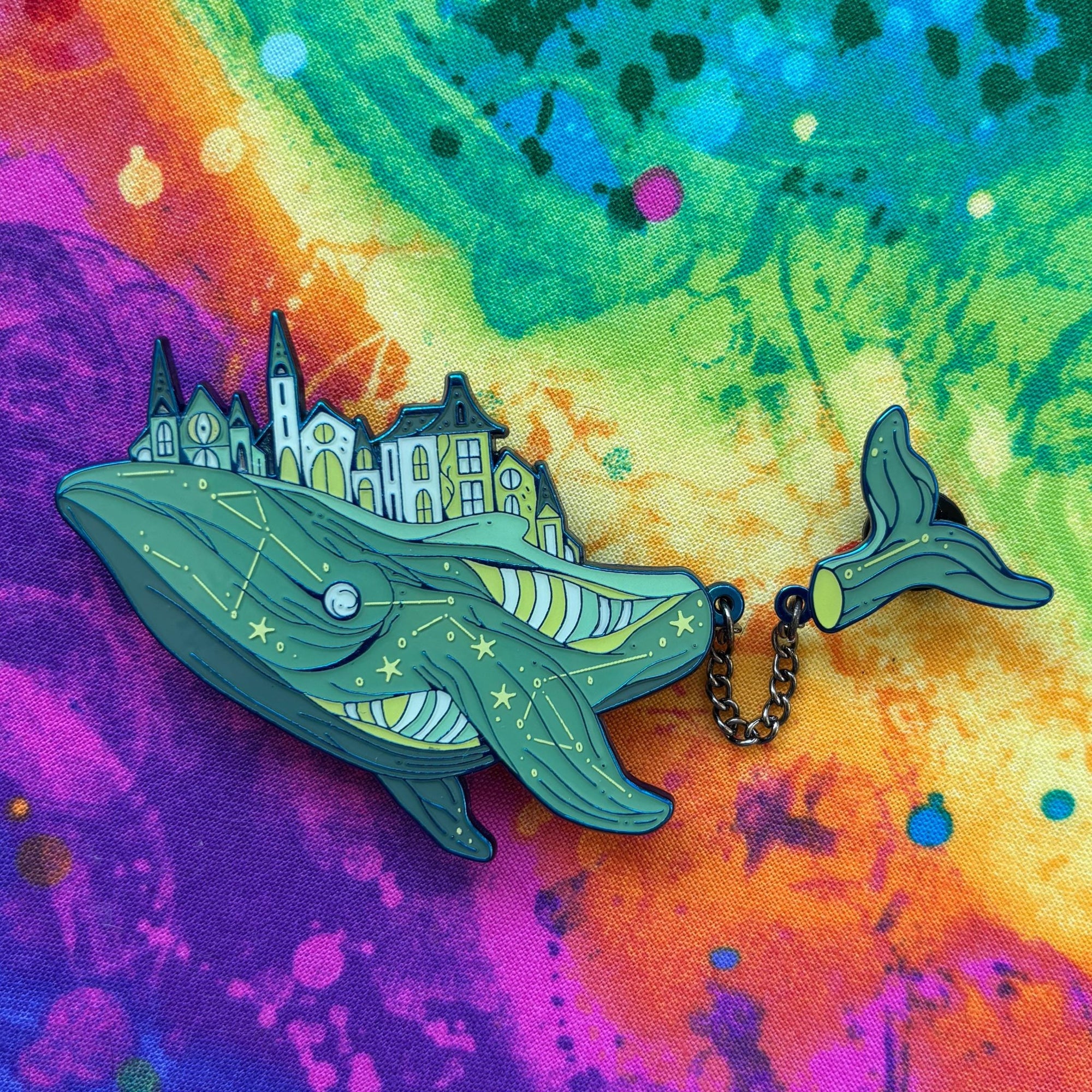 | Deadwale: a city of whale oil, steam, and secrets. This pin is based on one of my Dungeons and Dragons campaign settings, which takes place in a giant floating whale. The pin consists of two parts, connected by a chain. The whale body is approximately 2.5 inches (6 cm) wide, while the tail is about an inch wide (2.5 cm). The pin has recessed metal detailing. It has two pinbacks with rubber clutches on the whale body, and one pinback on the tail. This Mushroomy exclusive variant has soft enamel and epoxy, glow accents, screen print, and blue chrome plating. |