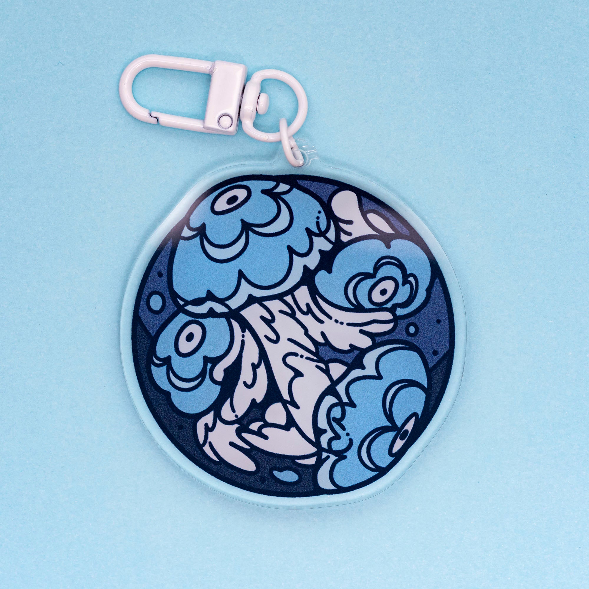 A bloom of eldritch, angelic jellyfish for Demiboy pride.This acrylic keychain is 2.5 inches (6.3 cm) long, double-sided with the same print on both sides. The keychain has a white lobster clasp.Please note: the keychain comes with protective film that should be peeled off.