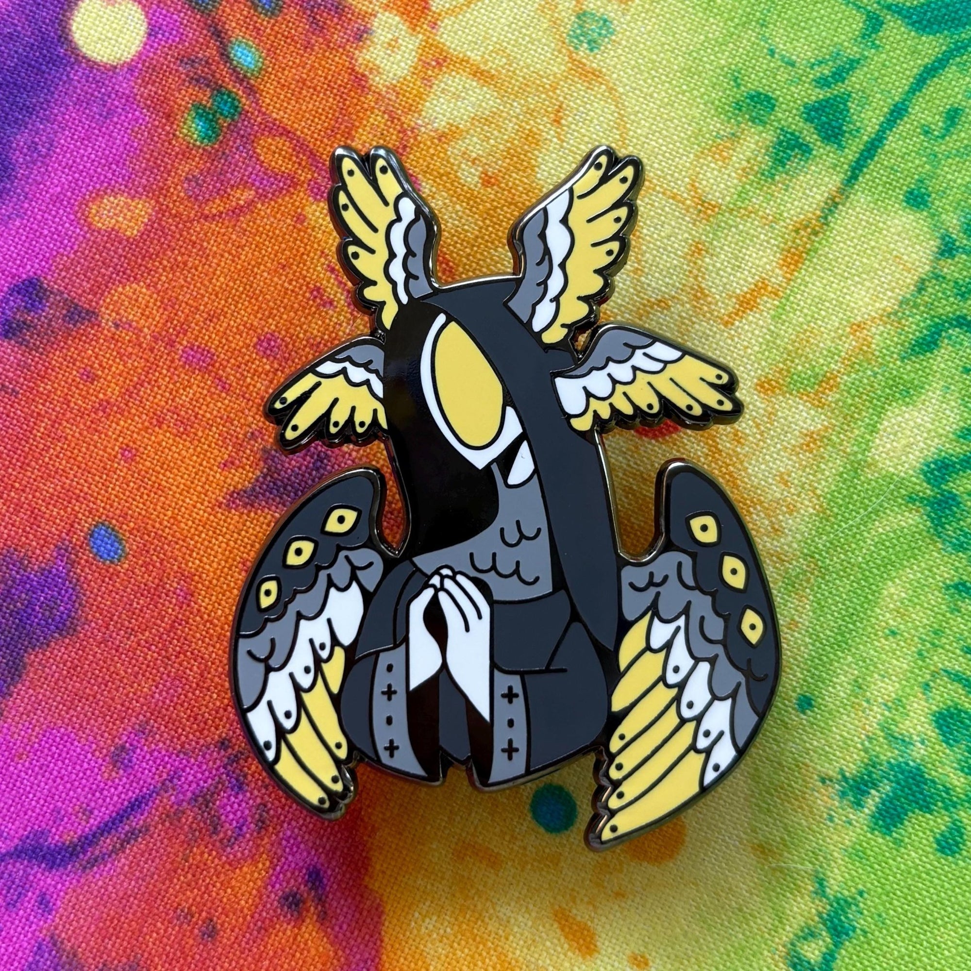 This pin has hard enamel, rubber backings, and two pin posts. It is 1.9 inches long with black nickel plating.