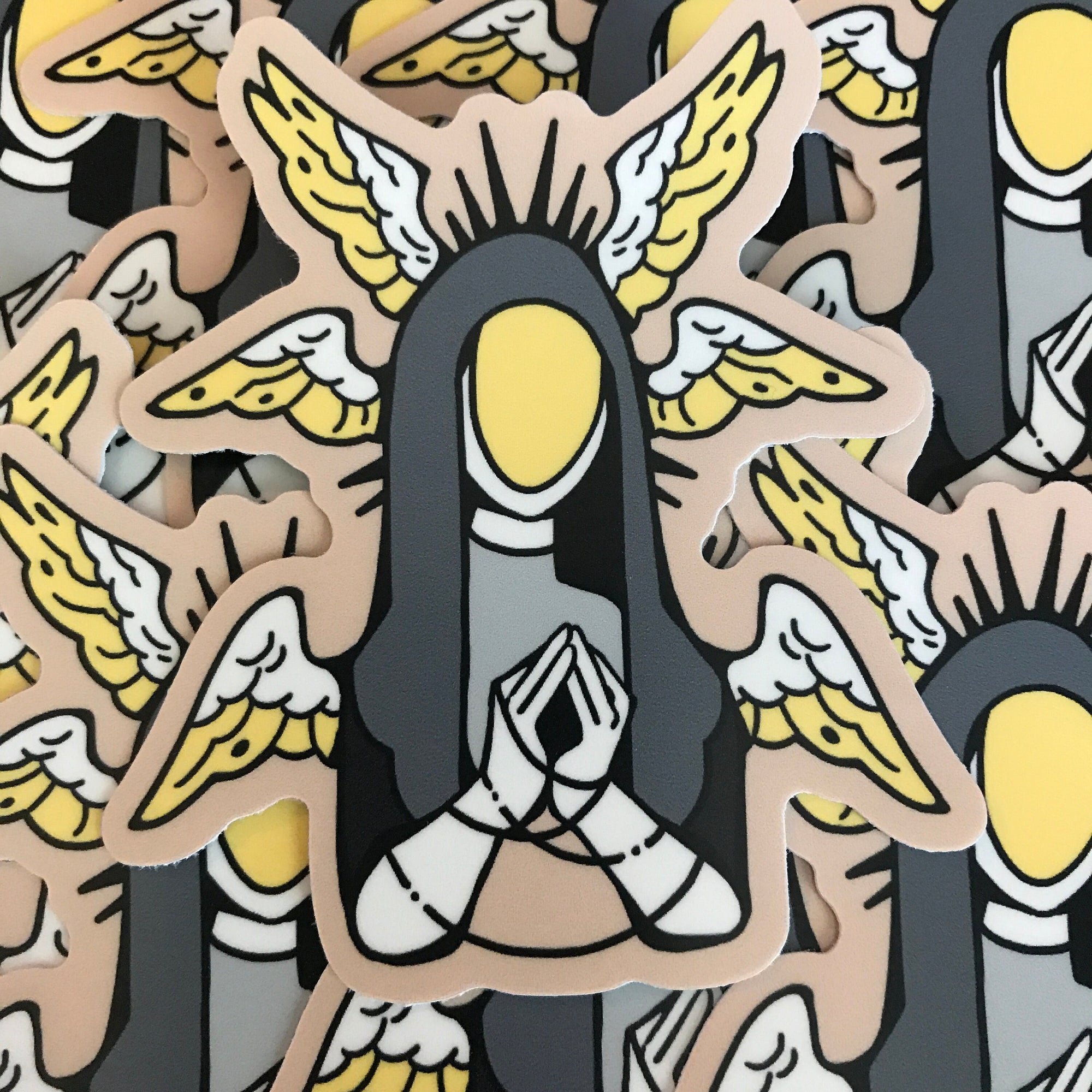 A praying angel for Demigender pride.This sticker is approximately 3 inches (7.6 cm) on the longest side, and printed on matte vinyl.