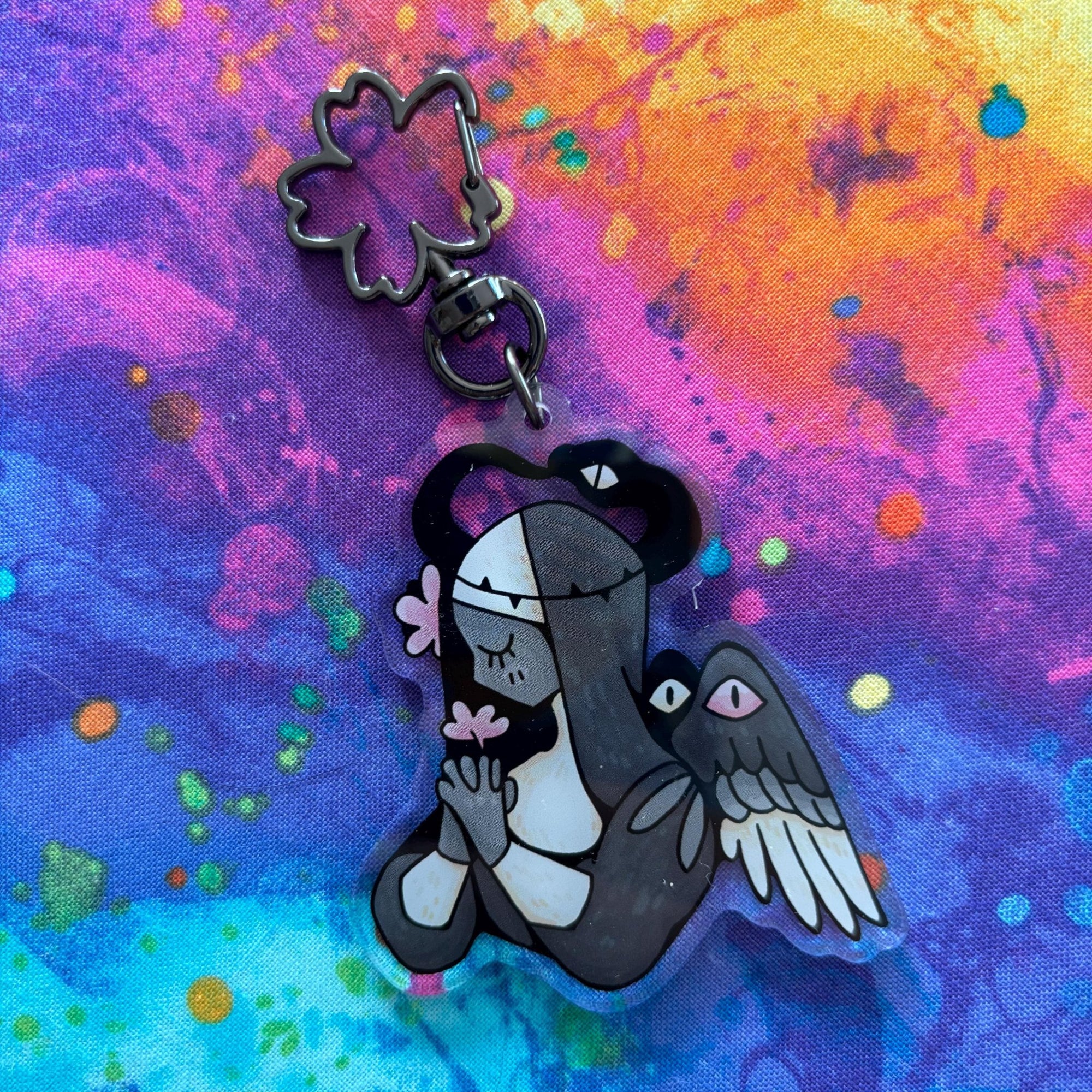 This acrylic keychain is 2.5 inches (6.3 cm) on the longest side, double-sided with the same print on both sides; it has a gun metal flower clasp.