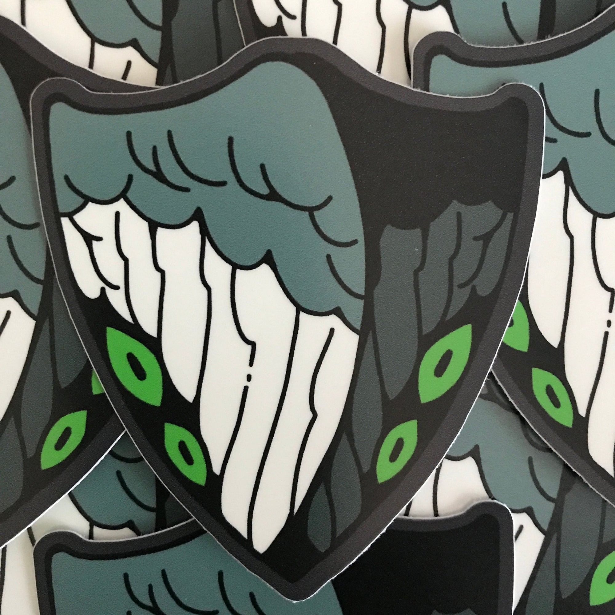 A shield of wings and eyes for Demiromantic pride.This sticker is approximately 3 inches (7.6 cm) on the longest side, and printed on matte vinyl.