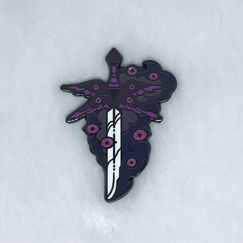 An eldritch angelic sword wreathed in smoke and eyes, for Demisexual pride. This pin is approximately 1.5 in (4 cm) on its longest side. The pin has hard enamel, black nickel plating, glitter accents, and two pin posts with rubber clutches.This listing is for standard grade pins only. Standard grade pins may have one or two tiny imperfections.