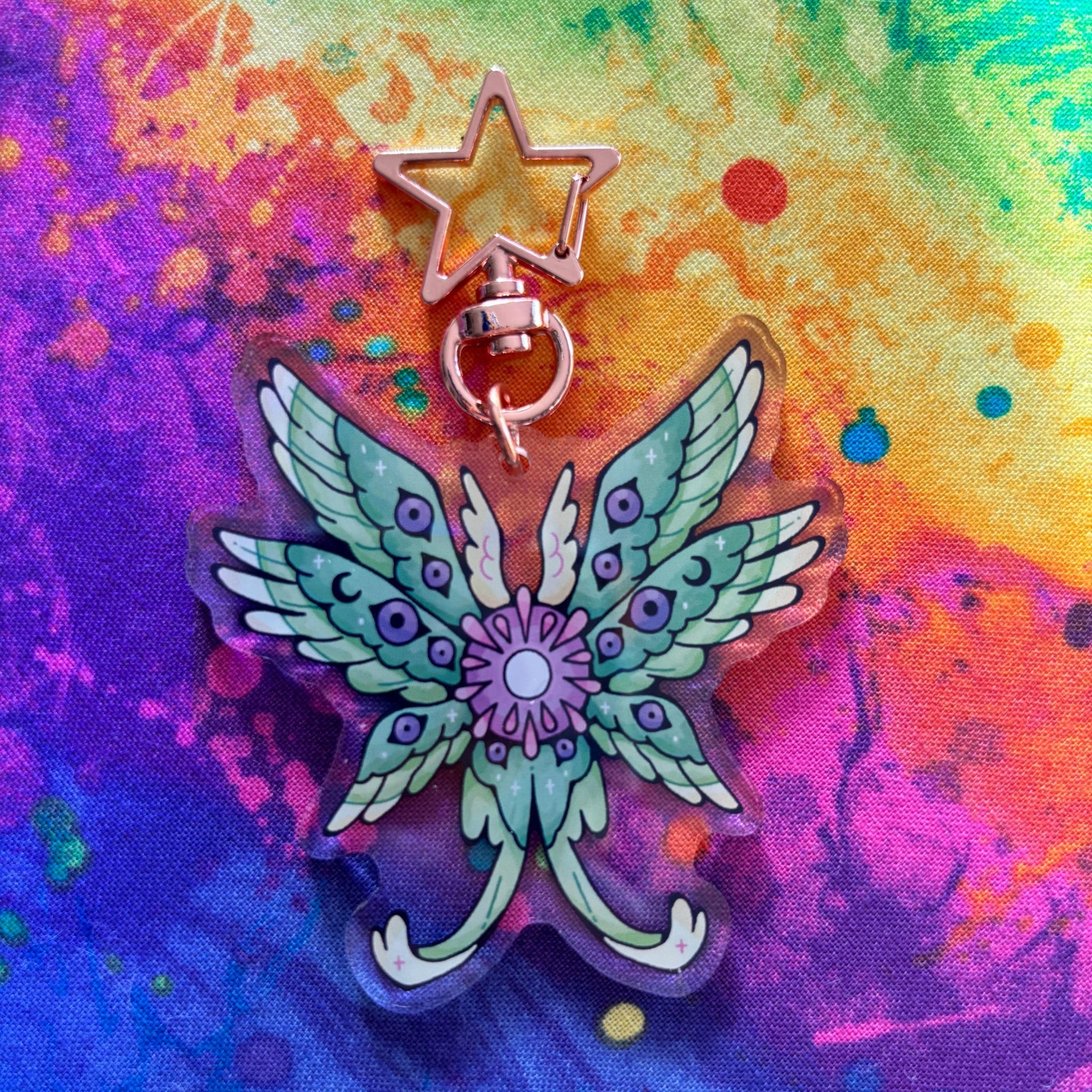 This acrylic keychain is 2.5 inches (6.3 cm) on the longest side, double-sided with the same print on both sides; it has a rose gold star clasp.