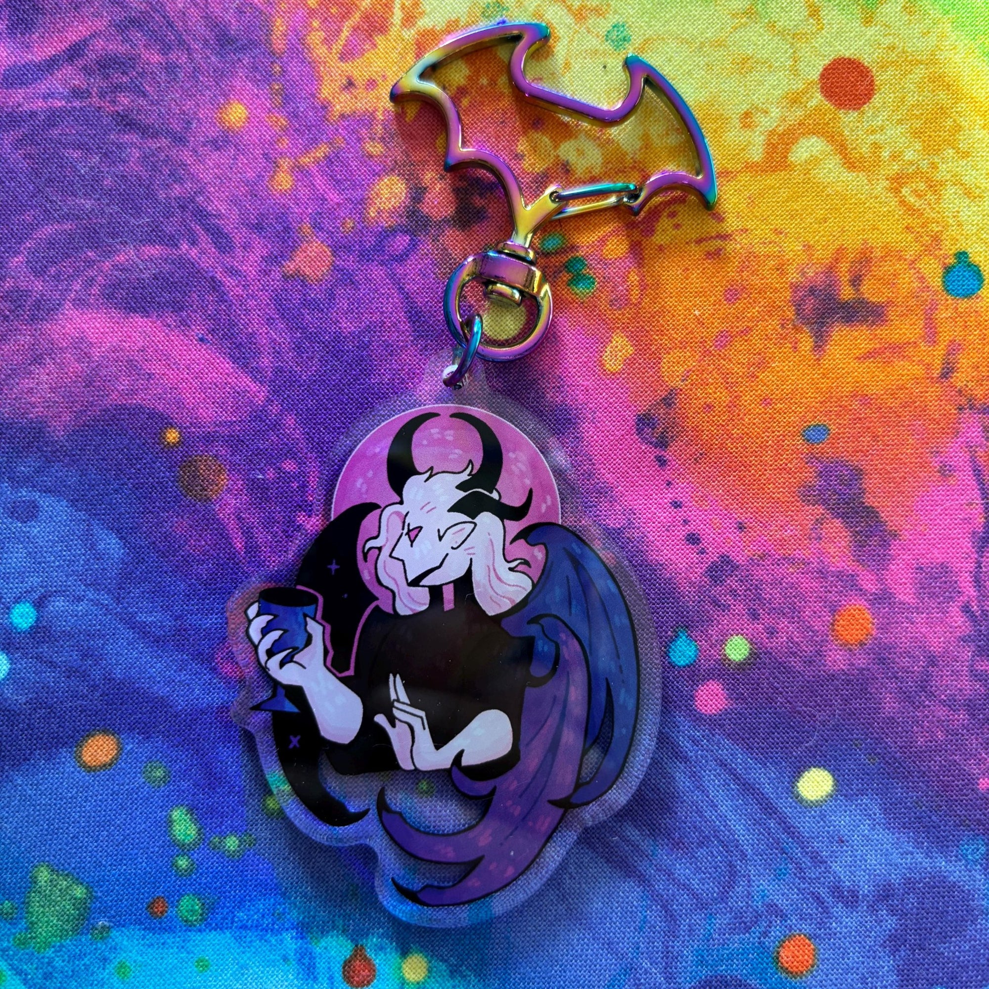 This acrylic keychain is 2.5 inches (6.3 cm) on the longest side, double-sided with the same print on both sides; it has a rainbow bat clasp.