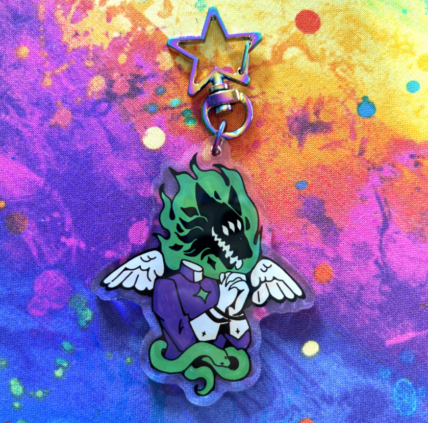 | This acrylic keychain is 2.5 inches (6.3 cm) on the longest side, double-sided with the same print on both sides; it has a rainbow star clasp. |