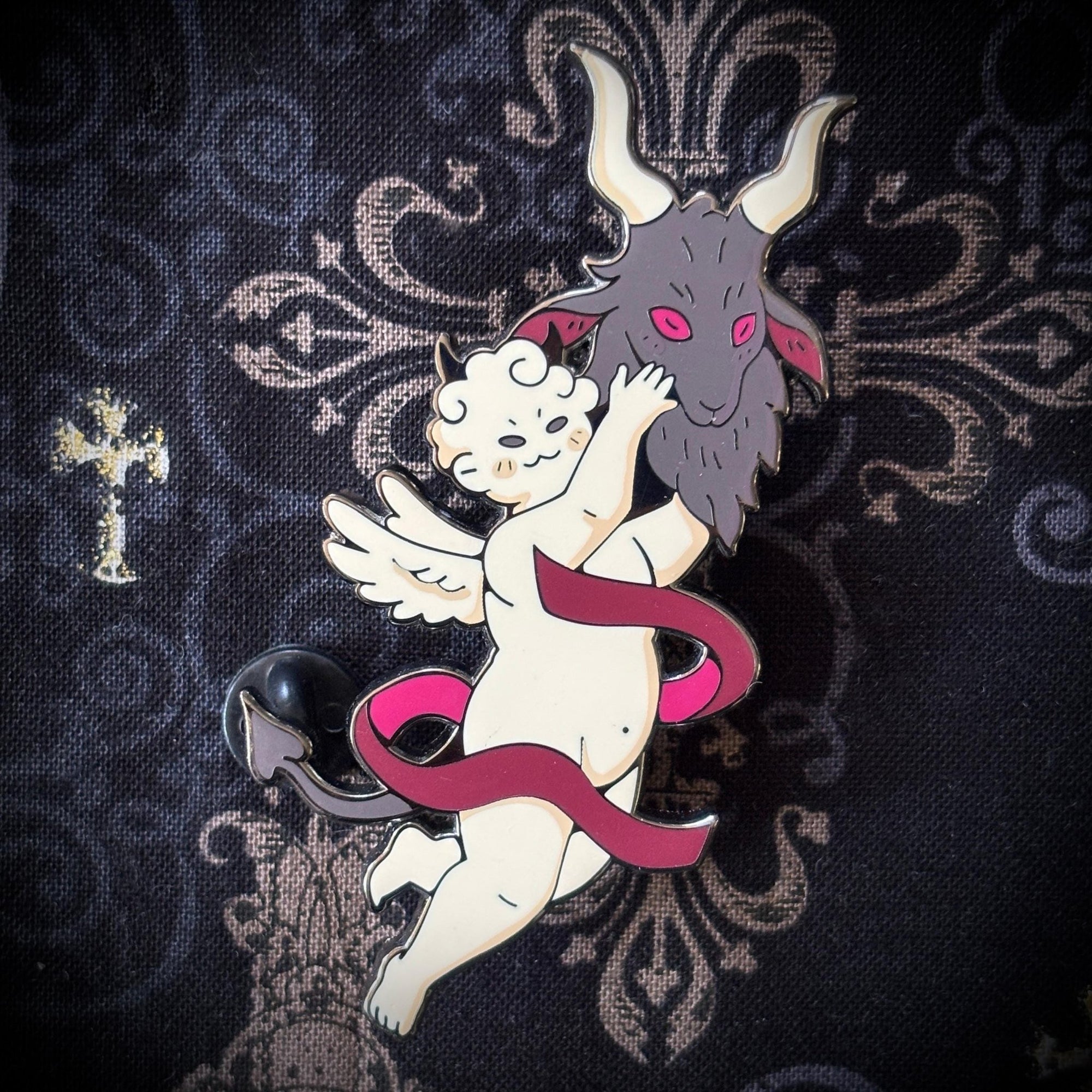 A little putto (cherub) for the Year of the Goat. Each pin is about 2 inches (5 cm) on the longest side with hard enamel, black nickel plating, and screen-print. They have two pin posts and rubber backings.