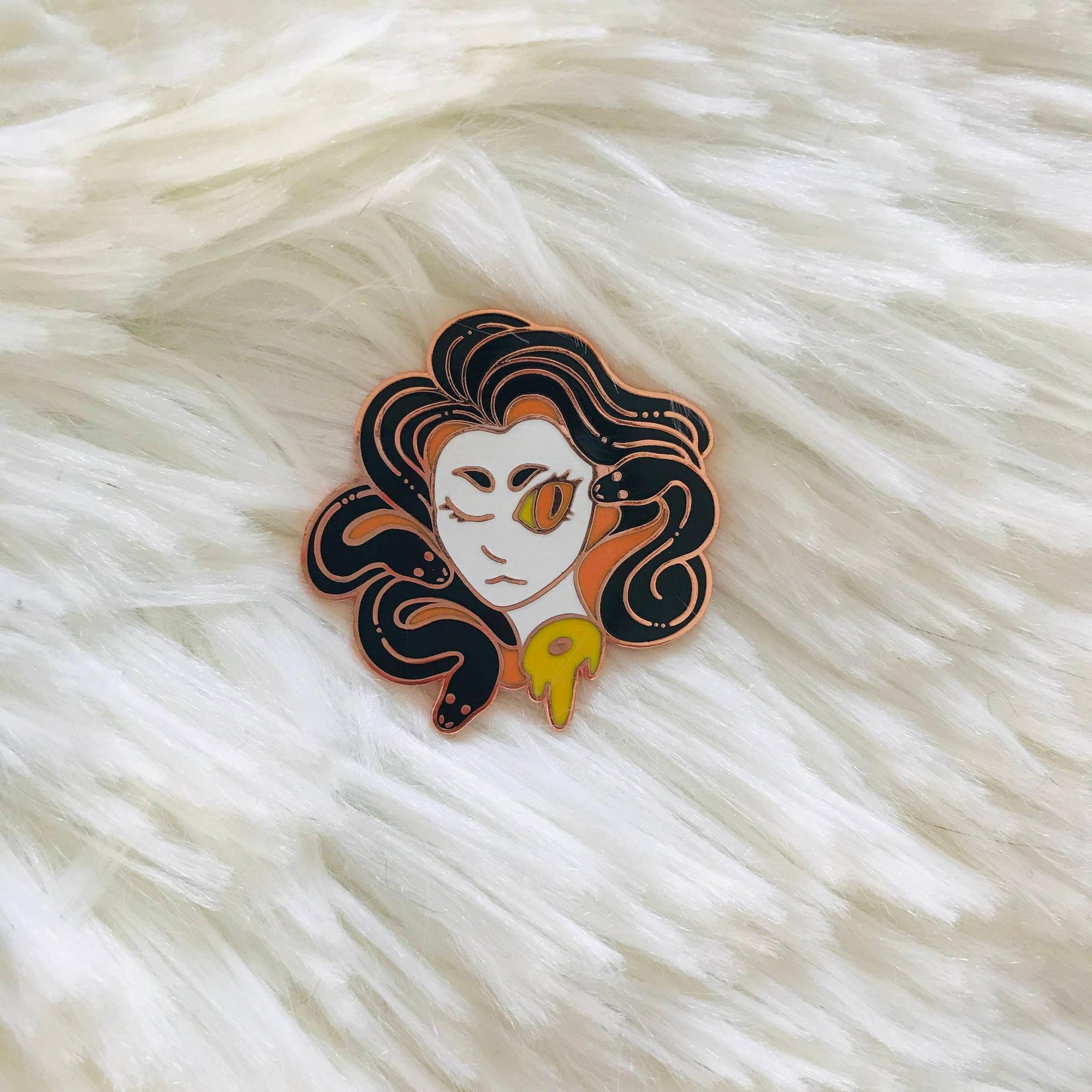 A pale medusa head with black snake hair. Though beheaded, she is still quite dangerous. This pin is a little gorey in honor of Halloween.  The pin is 1.3 inches (3.5 cm) long. It is copper plated with hard enamel, and has two pinbacks with rubber clutches. This listing is for standard grade pins only. Standard grade pins may have one or two tiny imperfections.