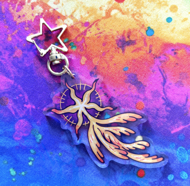 | This acrylic keychain is 2.5 inches (6.3 cm) on the longest side, double-sided with the same print on both sides; it has a gold star clasp. |
