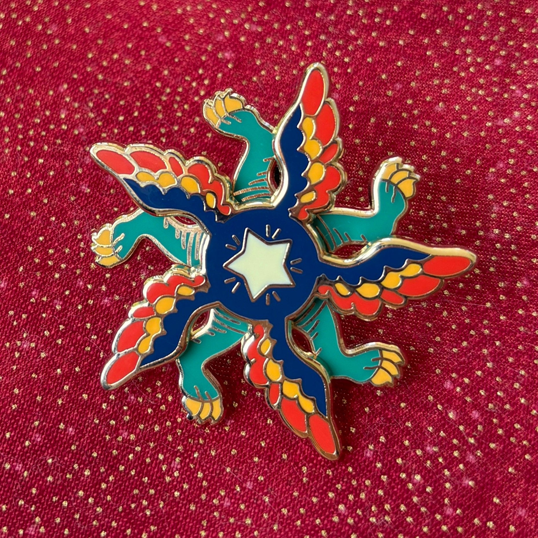 This pin is approximately 1.5 in (3.8 cm) wide. The pin has hard enamel, gold plating, and a single pin post with a rubber backing. This is a spinning pin - the legs spin while the front wings of the pin stays still!