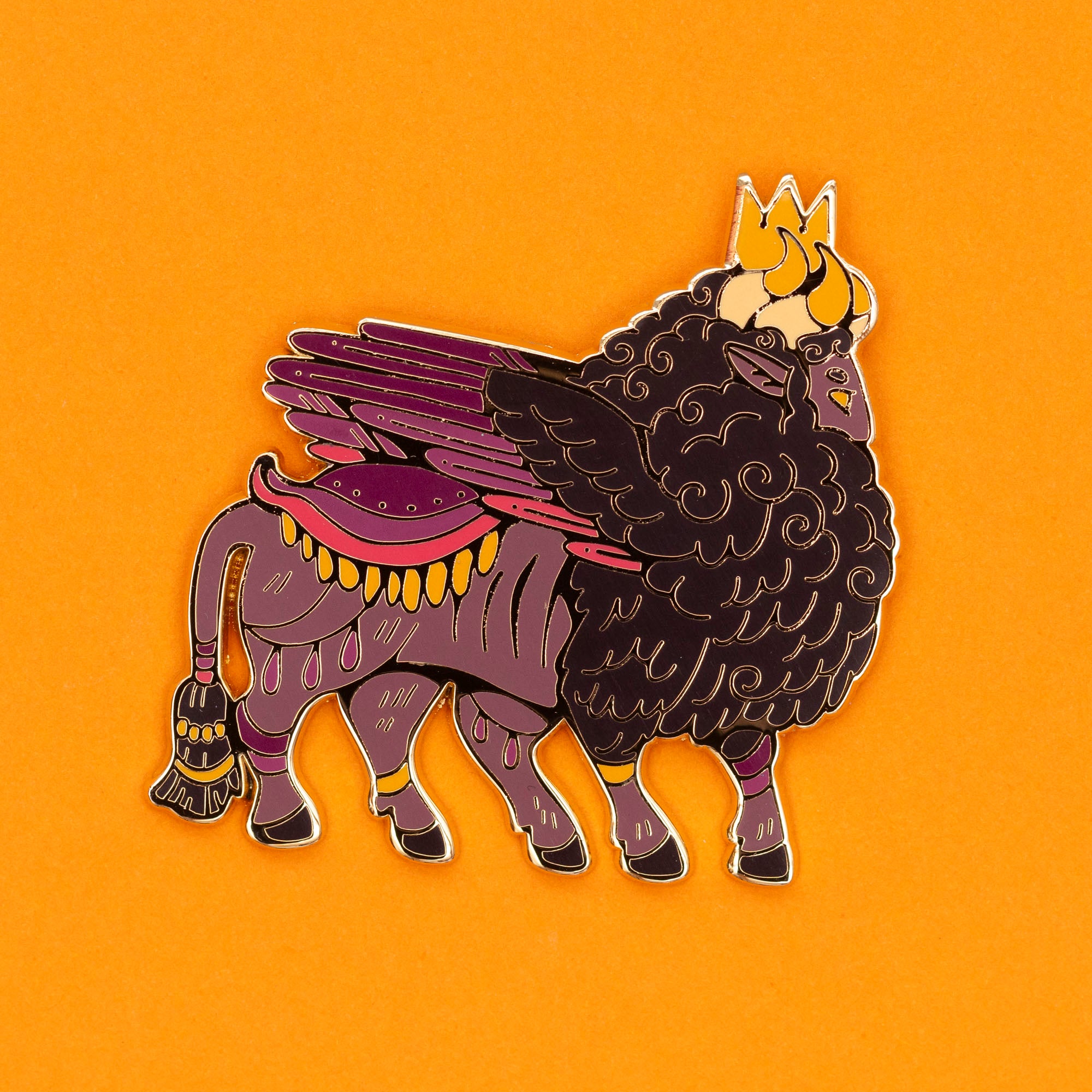 This pin is approximately 2 in (5 cm) wide. The pin has hard enamel, gold plating, and two pin posts with rubber clutches.