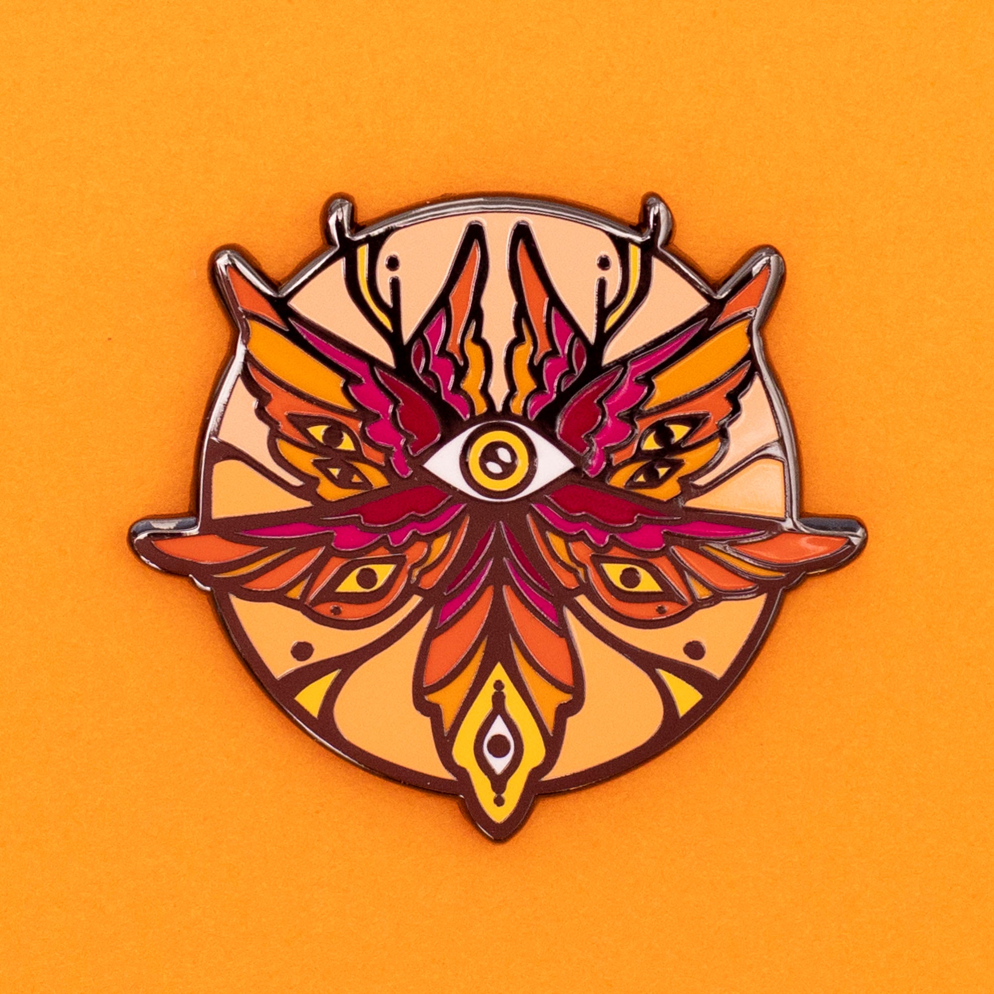 This pin is approximately 1.5 in (3.7 cm). The pin has hard enamel and two pin posts with rubber clutches. It is available in black nickel plating.