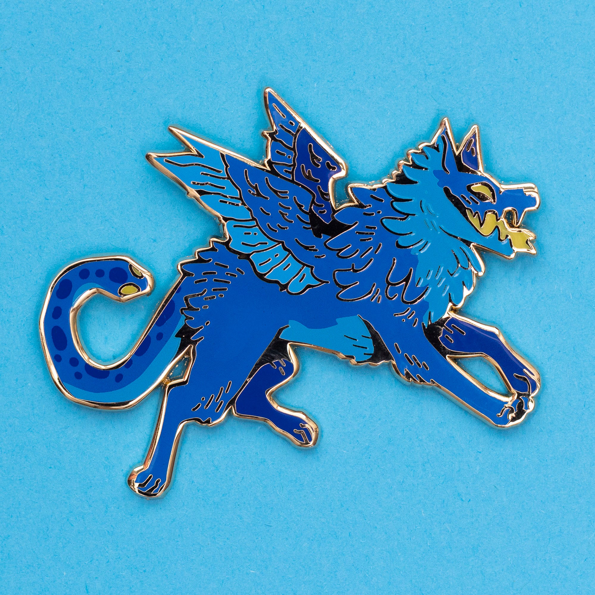 These pins are approximately 2 in (5 cm) wide, with two pin posts with rubber clutches. Marchosias has hard enamel with screen printed details and gold plating.