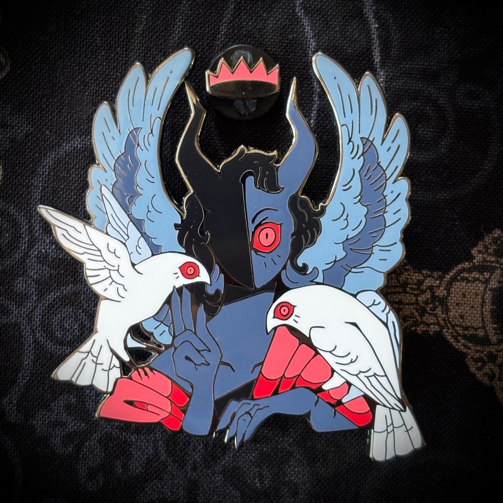 These pins are approximately 2 in (5 cm) wide. The Naberius pin has two pin posts with rubber clutches; and includes a mini crown pin with a single pin post. These pins have black nickel plating and hard enamel.