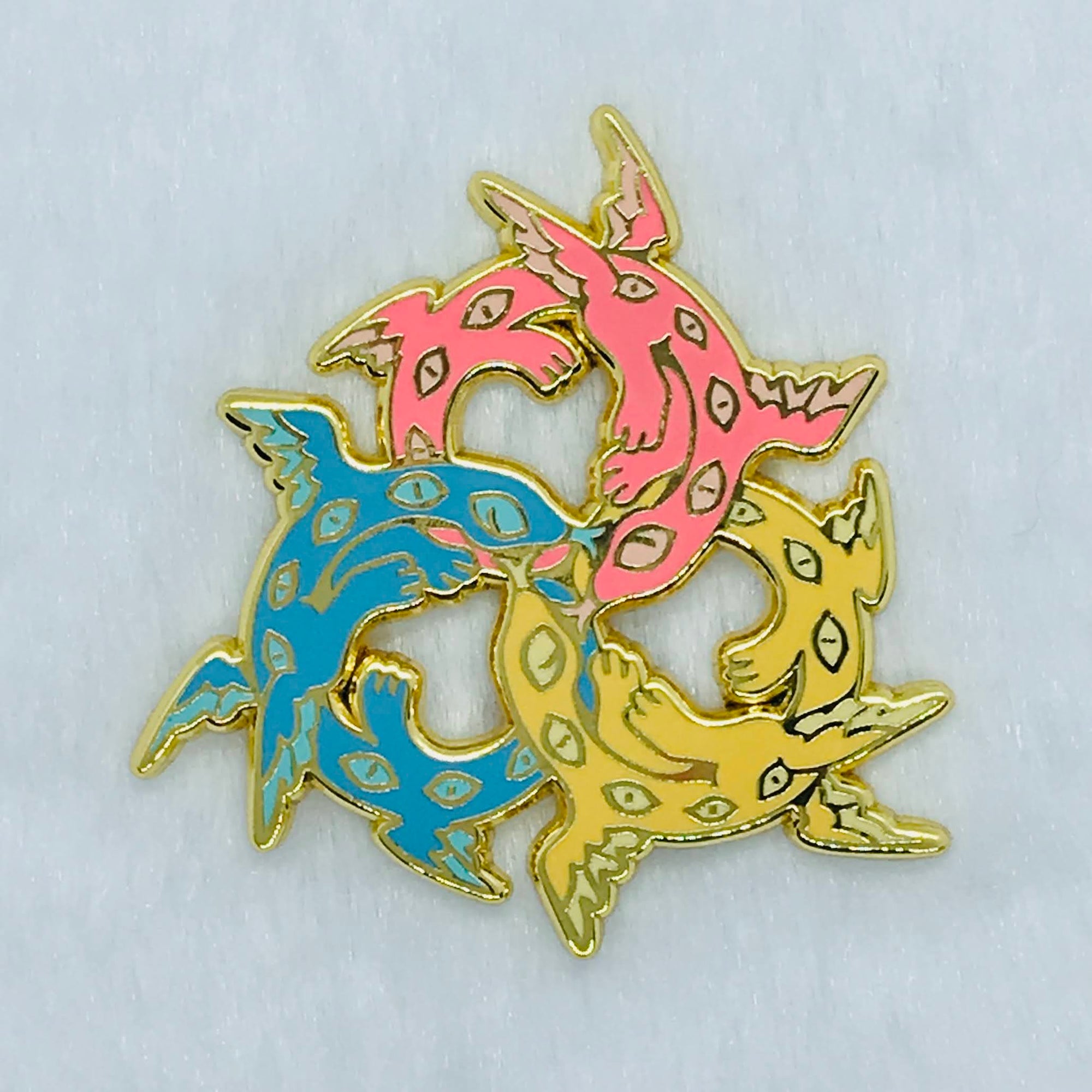 A trio of angelic serpents, for Pansexual pride. This pin is approximately 1.7 in (4.5 cm). The pin has hard enamel, gold plating, and three pin posts with rubber clutches.