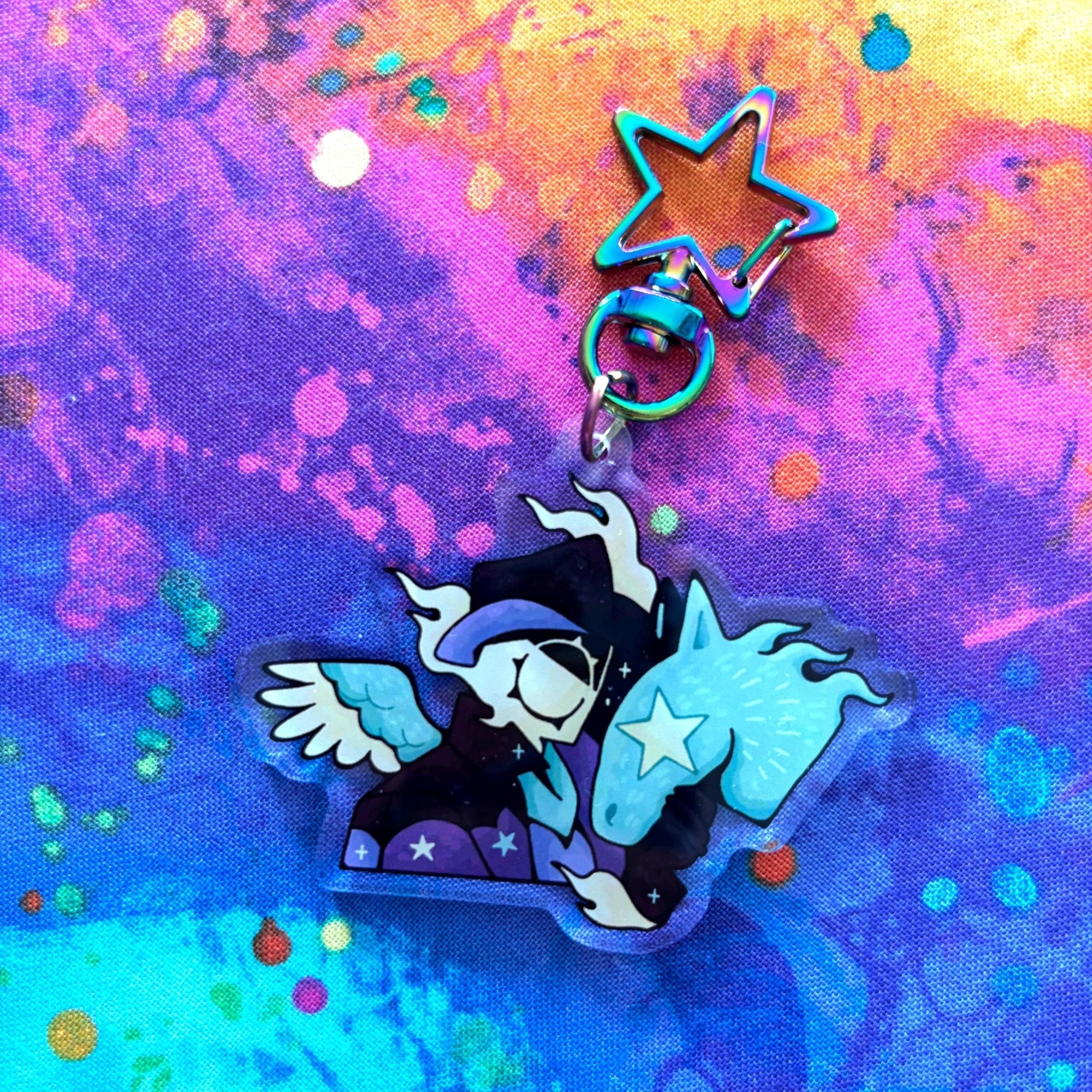 This acrylic keychain is 2.5 inches (6.3 cm) on the longest side, double-sided with the same print on both sides; it has a rainbow star clasp.