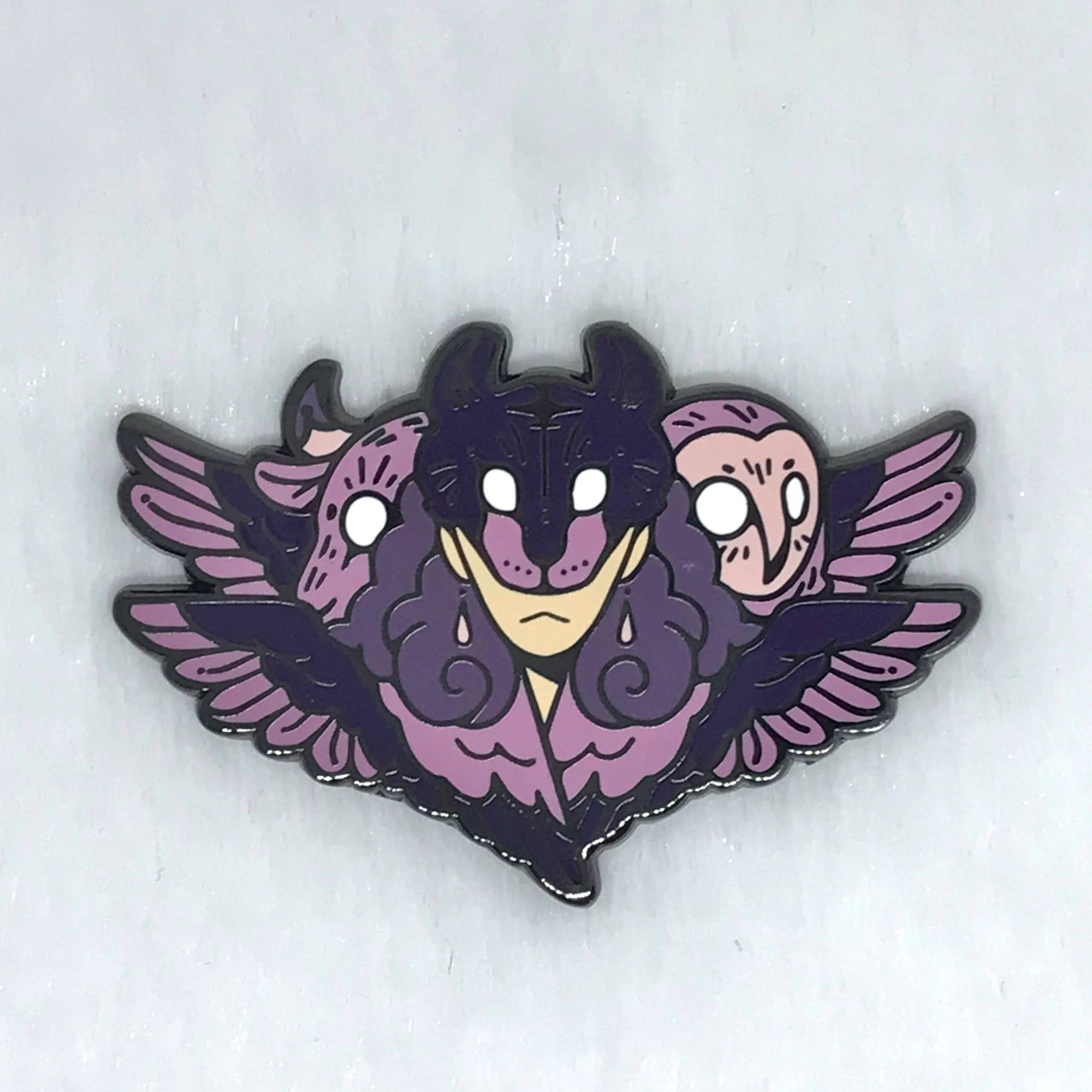 A many-faced cherub in purple, for Queer pride. This pin is approximately 2 in (5 cm). The pin has hard enamel, black nickel plating, and two pin posts with rubber clutches. This listing is for standard grade pins only. Standard grade pins may have one or two tiny imperfections.