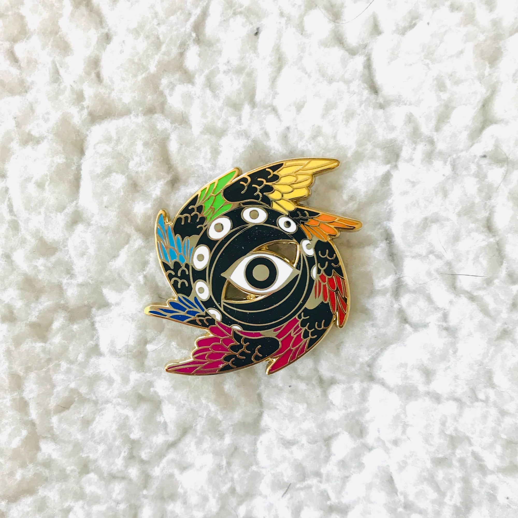 Throne Angel measures 1.5 inches (4 cm) long. It has two pinbacks with rubber clutches and features hard enamel. Throne Angel is available in white or black rainbow with gold plating.