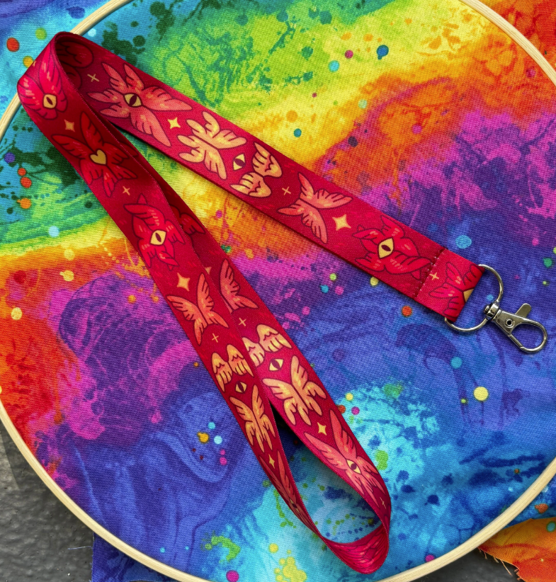 | A lanyard featuring red seraphim. The lanyard is approximately 1 inch (2.5 cm) wide, 19 inches (48 cm) long. It has a metal lobster clasp. |