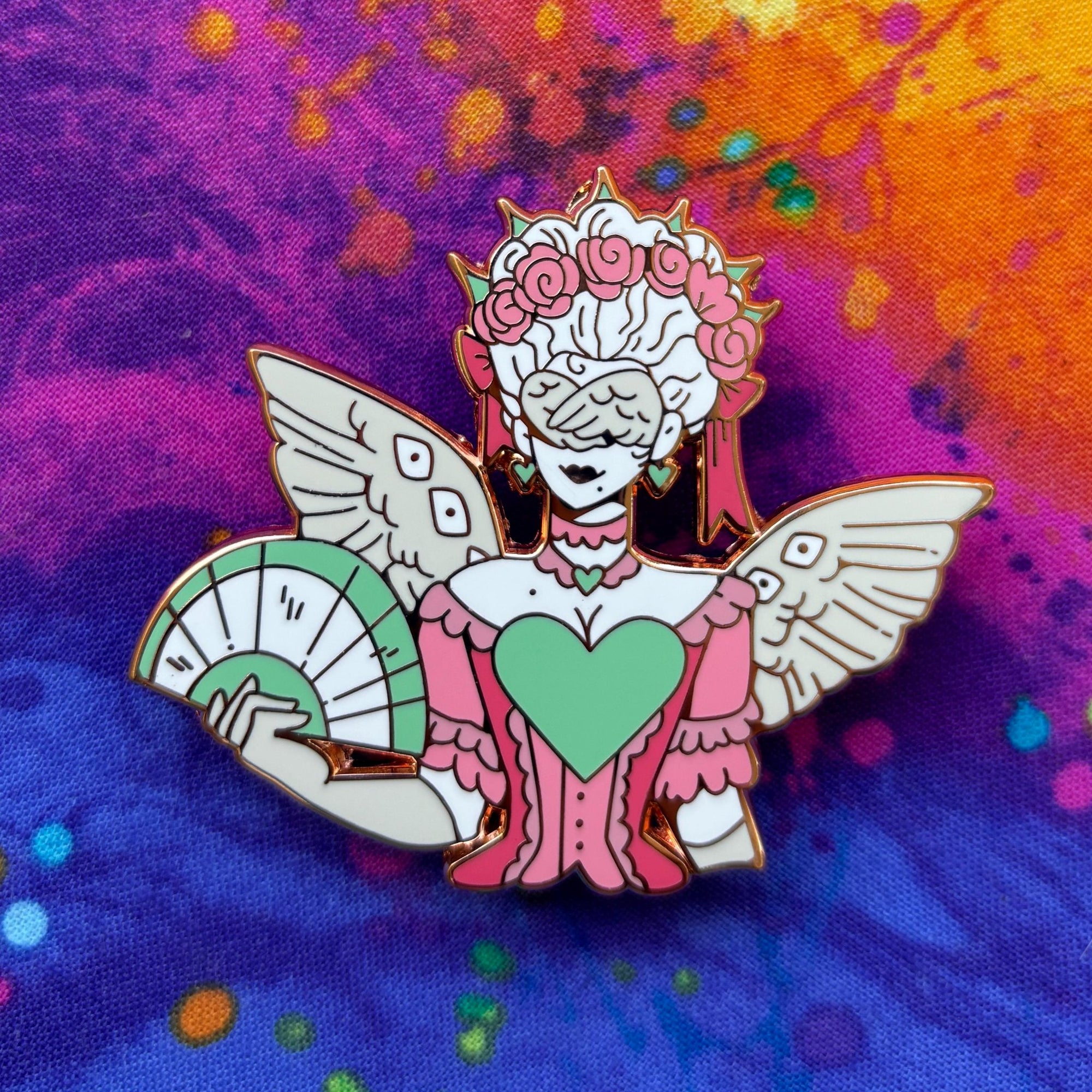 | Hard enamel, rose gold plating, two pin posts. About 2.4 inches wide. |