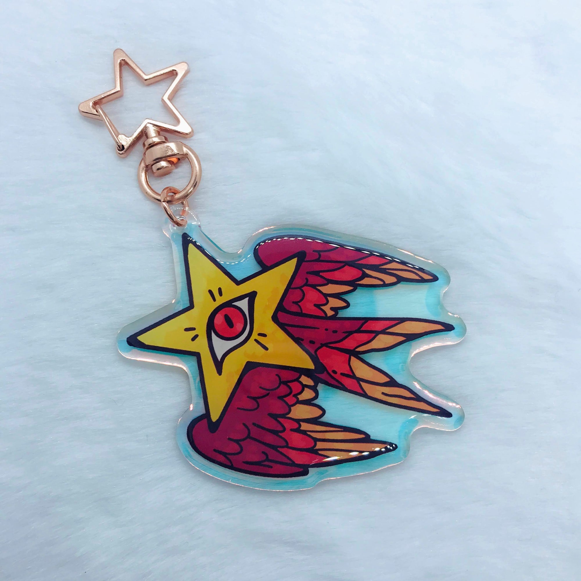 A sunset-hued starry angel. This keychain is 2.5 inches (6.3 cm) long, with epoxy on one side, and rainbow acrylic on the other. The keychain has a gold star-shaped clasp.