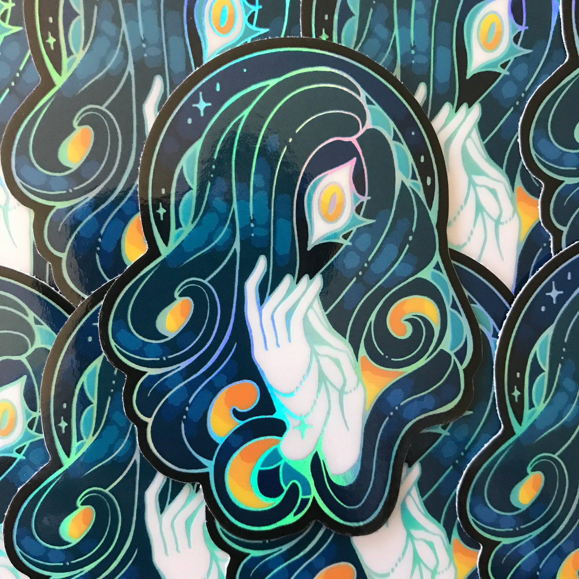 This sticker is approximately 3 inches (7 cm) on the longest side. It features holographic linework and is printed on glossy vinyl.