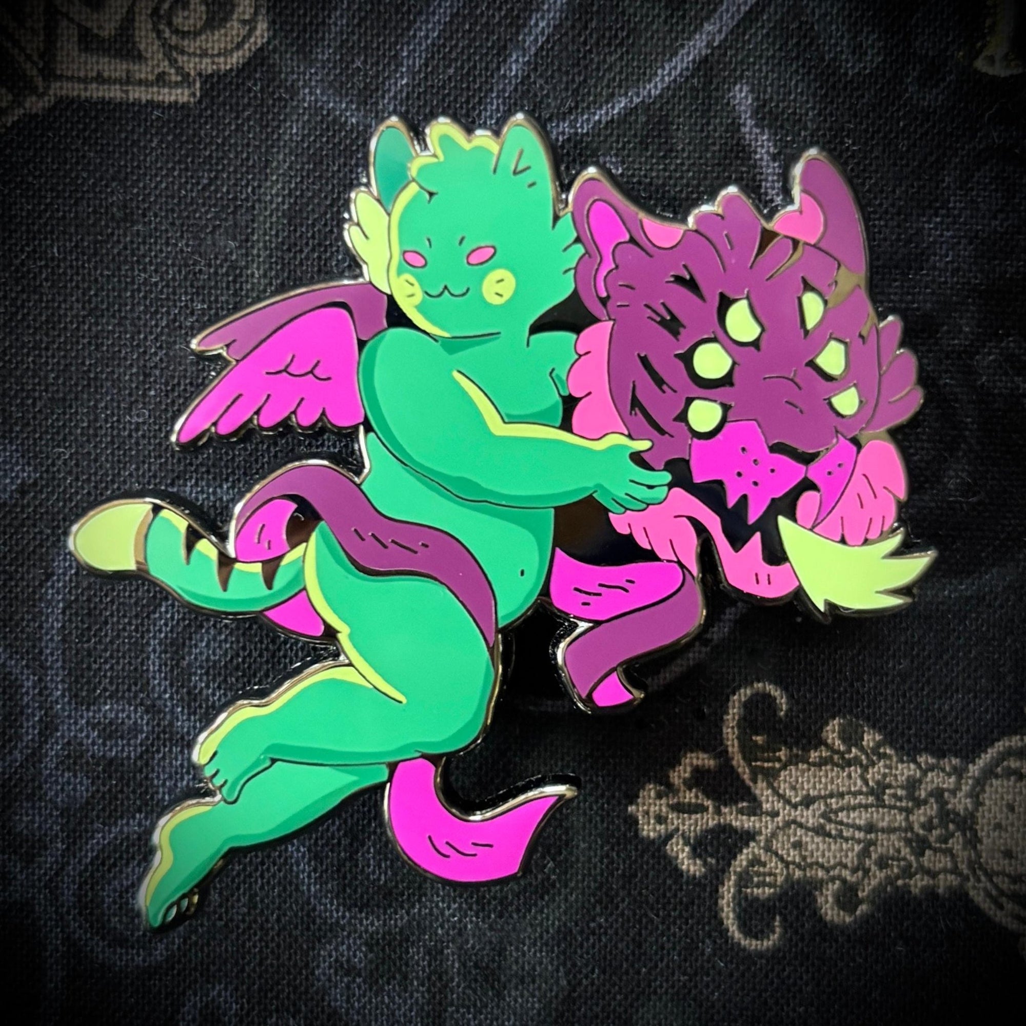 Each pin is about 2 inches (5 cm) on the longest side with hard enamel, black nickel plating, and screen-print. They have two pin posts and rubber backings.