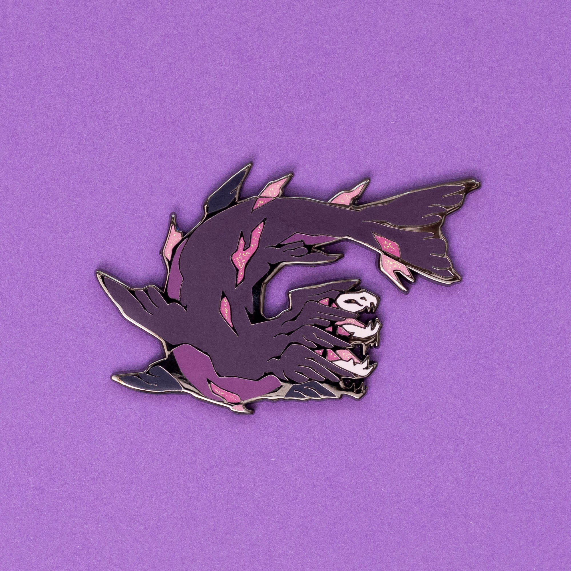 These pins are approximately 2 in (5 cm) wide, with two pin posts with rubber clutches. Vepar has hard enamel with glitter accents, and black nickel plating.