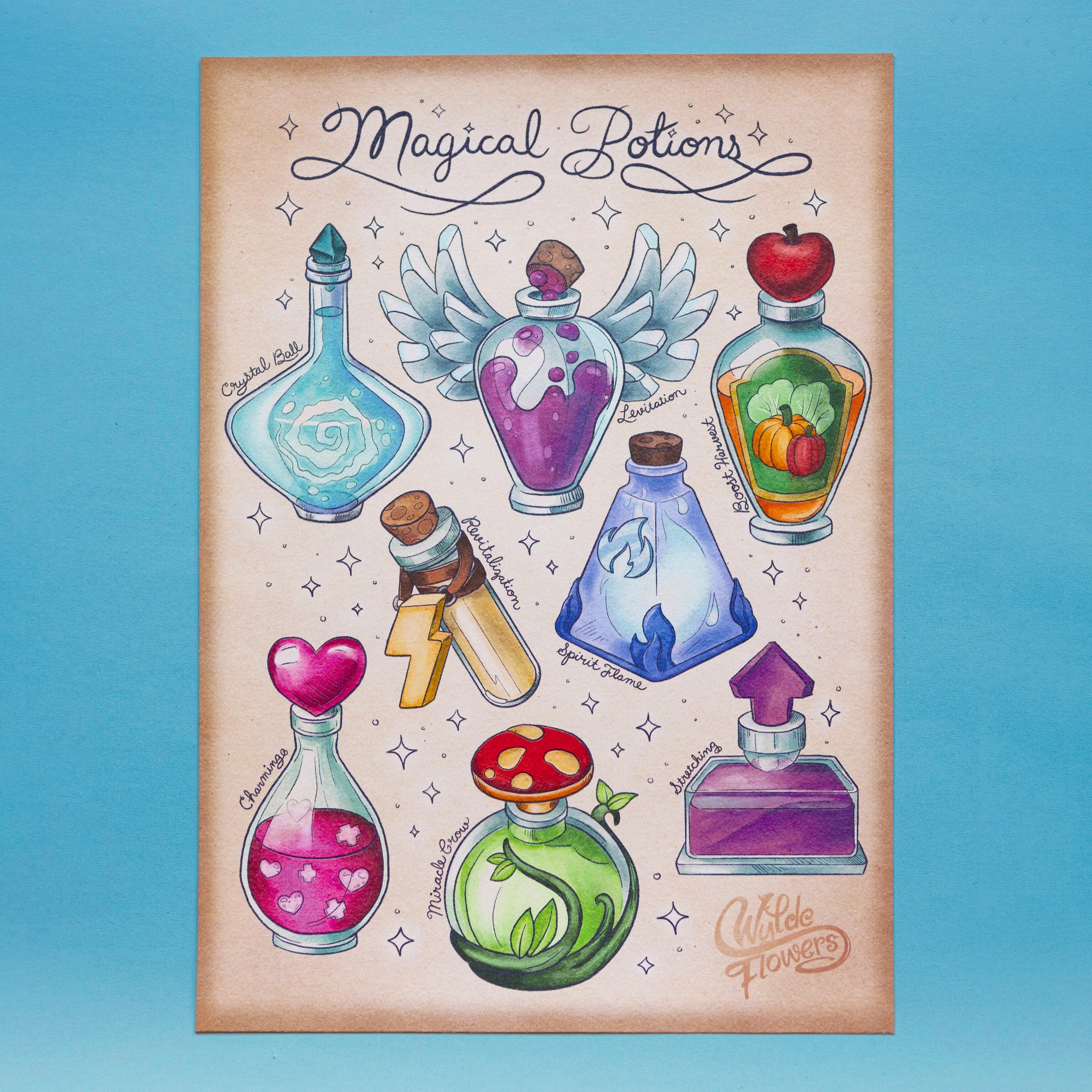 Brush up on your potion crafting with this exquisite illustration! Detailing a magical selection of potions from the Wylde Flowers universe, this versatile print would be right at home on your wall-- or in your compendium! ✨
