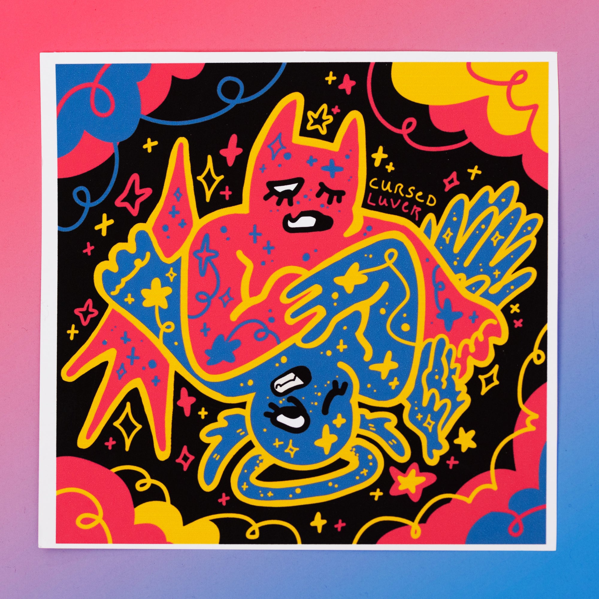 an angel and a demon embrace! this was printed at home by me using an epson 3880 and archival inks/paper, which means it is extra vibrant and fade-resistant!