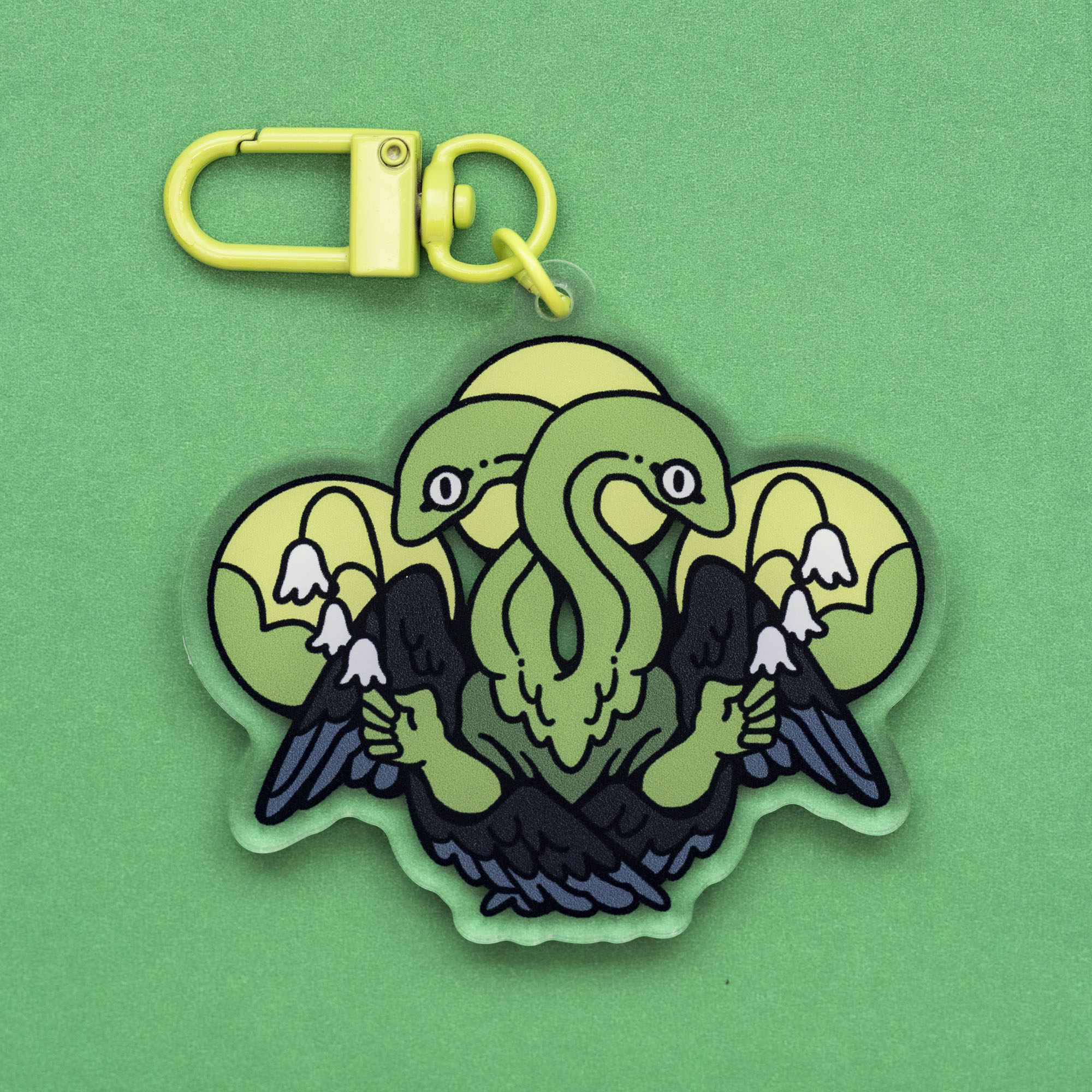 A two-headed serpent angel holding lilies of the valley, for Aromantic pride. This acrylic keychain is 2.5 inches (6.3 cm) long, double-sided with the same print on both sides. The keychain has a green lobster clasp.Please note: the keychain comes with protective film that should be peeled off.