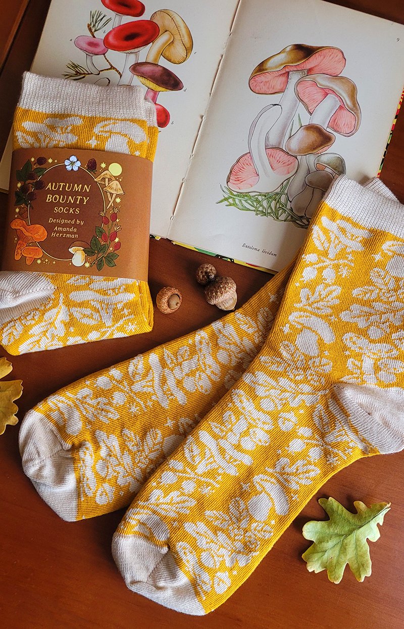 Autumn bounty socks celebrate the bounty of autumn. From fungi, to nuts and berries, these socks are designed to revel in the wonders of the crisp harvest season.