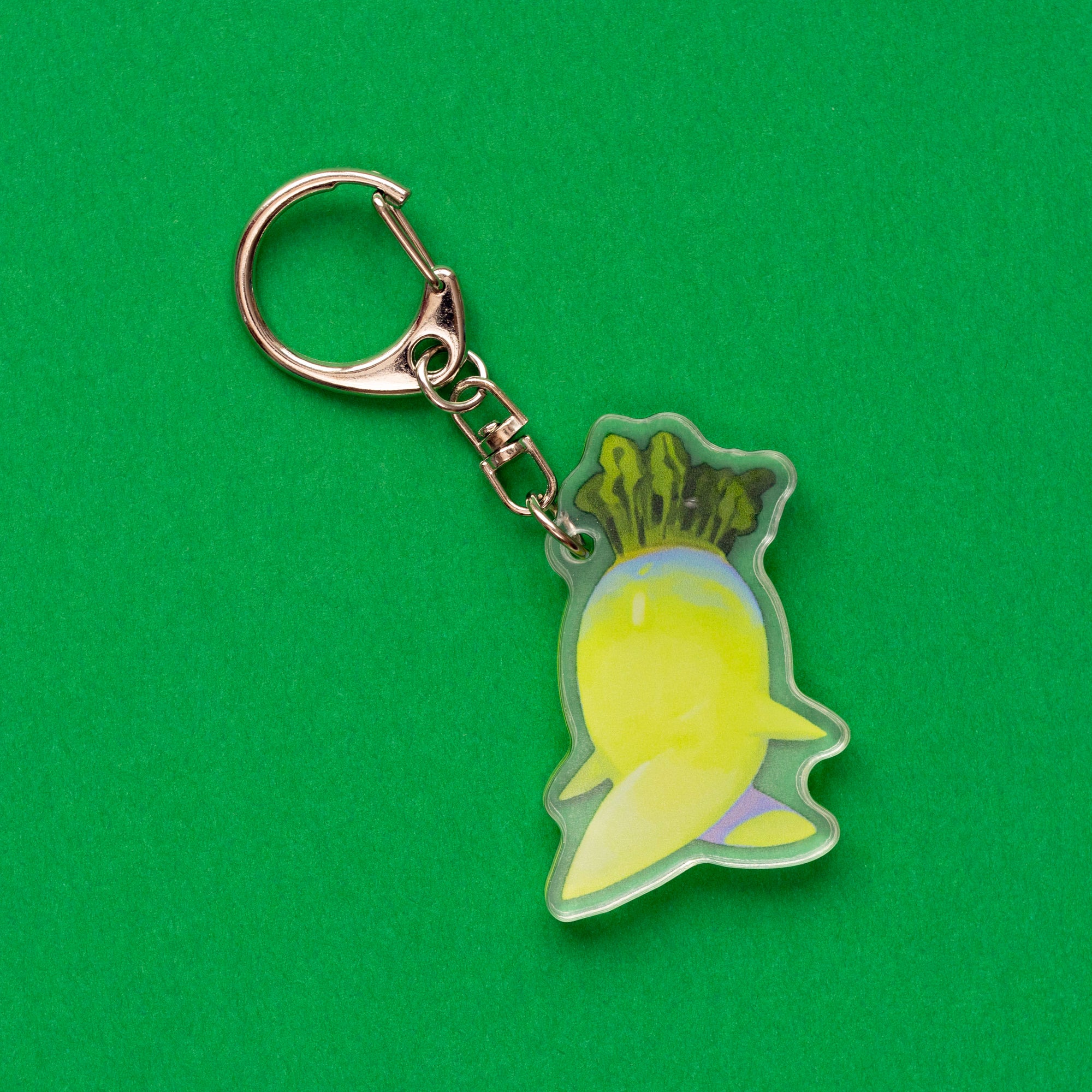 A Dancing Daikon; it must have gotten out of the potion ingredients cabinet! Don't let it get away! High quality acrylic charms of original designs. 2-3" diameter sizes each (varies by design) so you can see all the finer details, and each comes with a lobster claw keychain to ensure an easy clasp. (Please note: protective plastic sheeting come on each item on the flat side, and can be removed or left on to the purchaser's desire!)