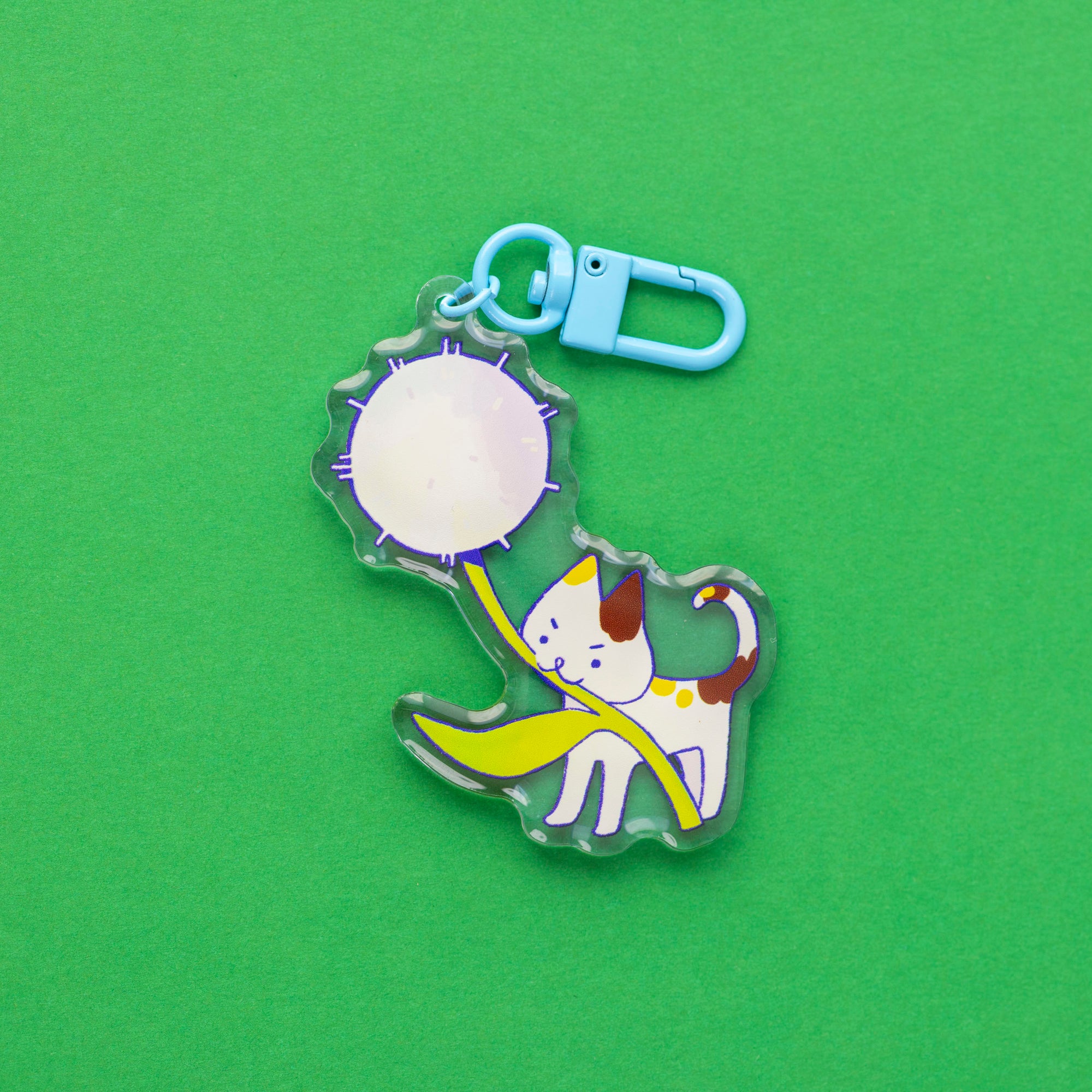 Lil' calico cat carrying a cute dandelion! Double sided charm with epoxy over tinted acrylic, comes with a green clip.
