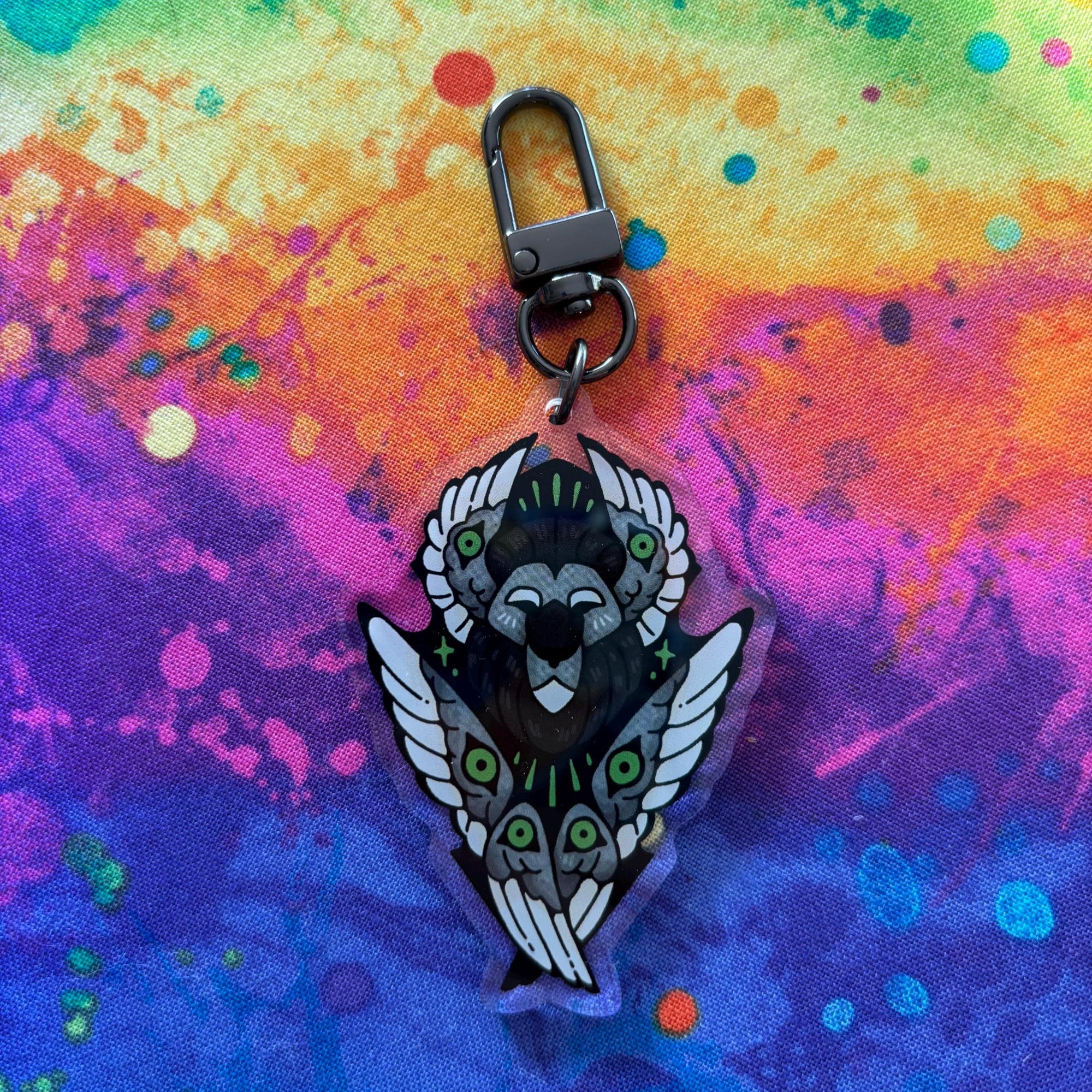 This acrylic keychain is 2.5 inches (6.3 cm) on the longest side, double-sided with the same print on both sides; it has a gun metal lobster clasp.