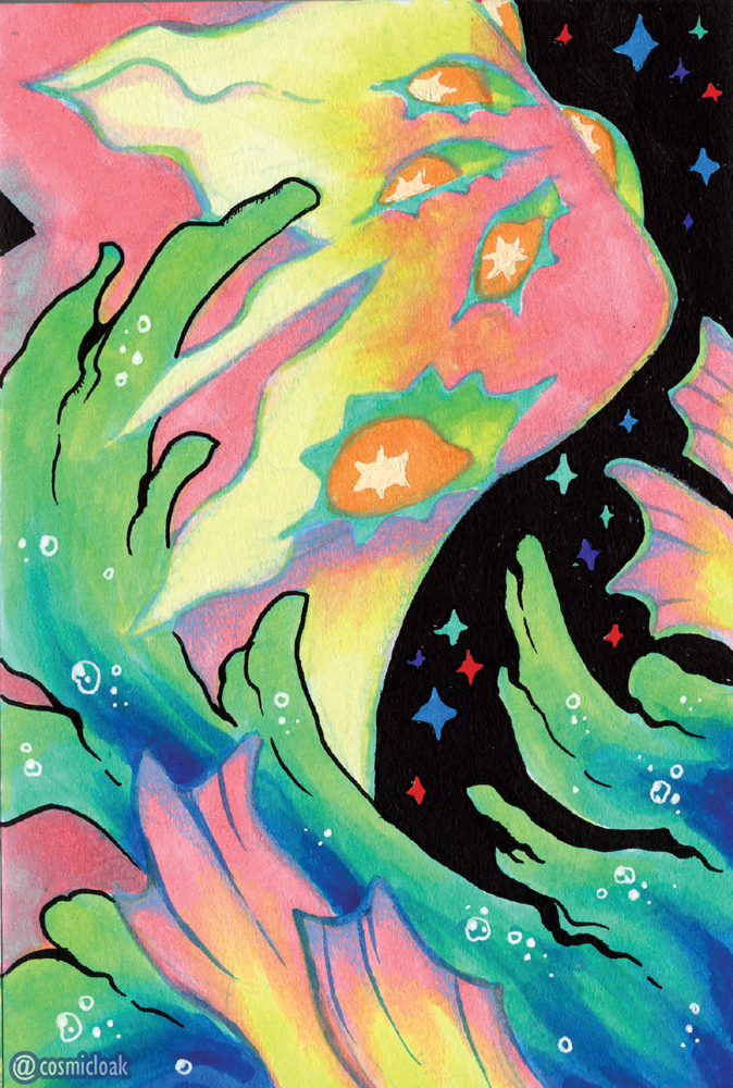 colorful space mermaid resting along the fringes of a black hole. Part 4 of 5 of "Mermay 2023" series