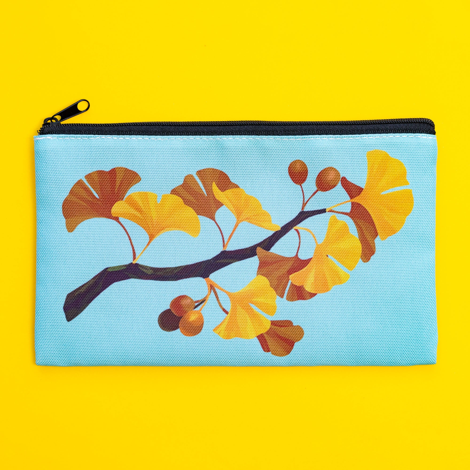 A double sided makeup or cosmetics pouch featuring a botanical drawing of a lychee branch.