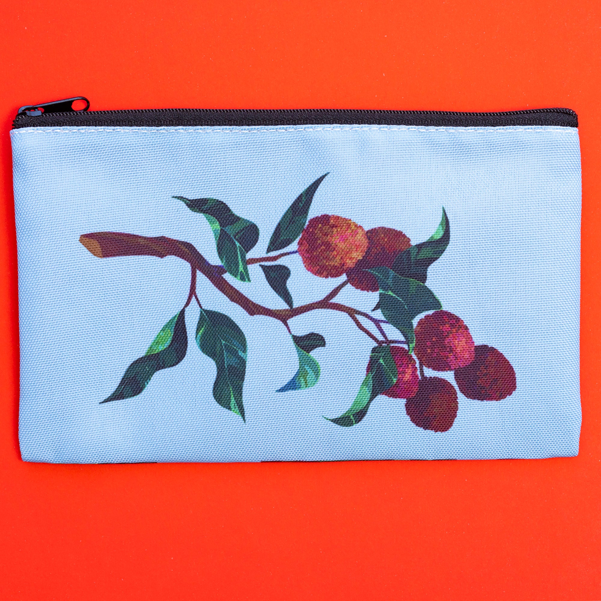 A double sided makeup or cosmetics pouch featuring a botanical drawing of a lychee branch.