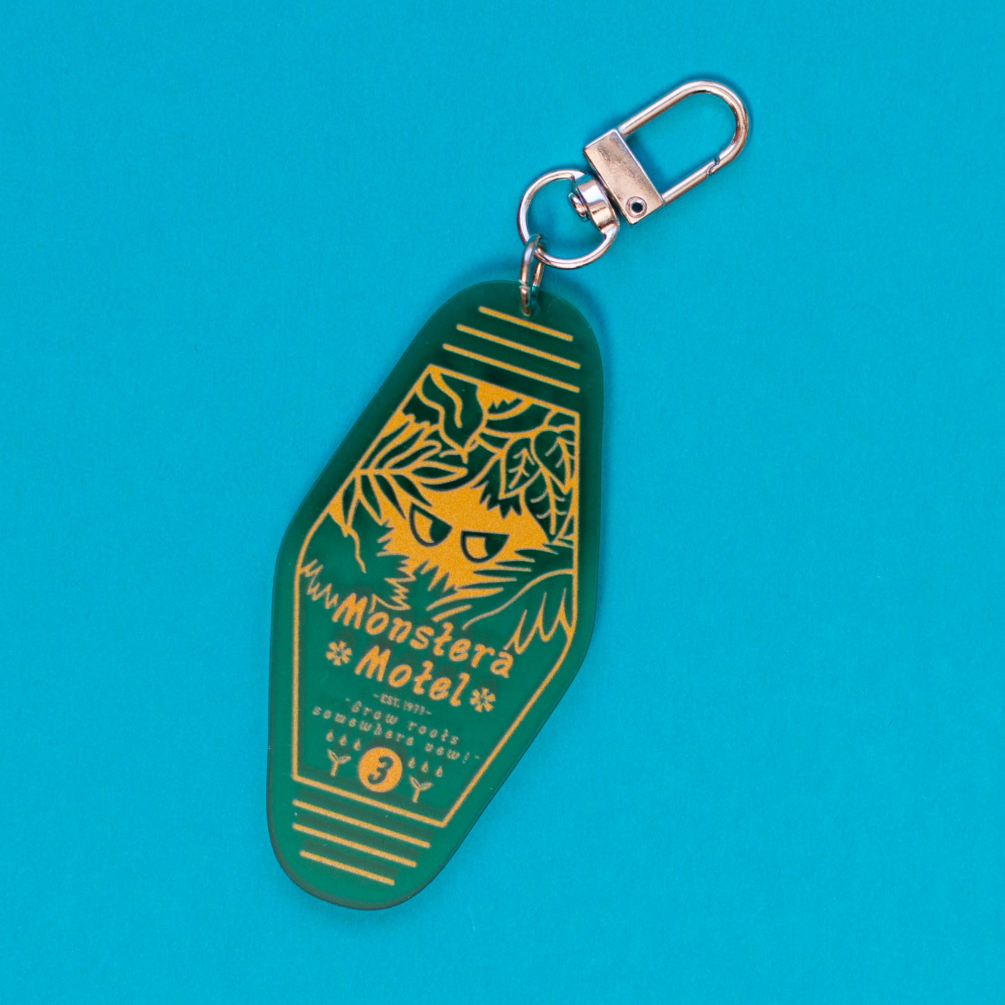 Grow roots somewhere new! These motel-styled keychains are printed onto a high-quality translucent green acrylic, with a sturdy metal clasp. Hang this onto a backpack or keys to add a little flair!