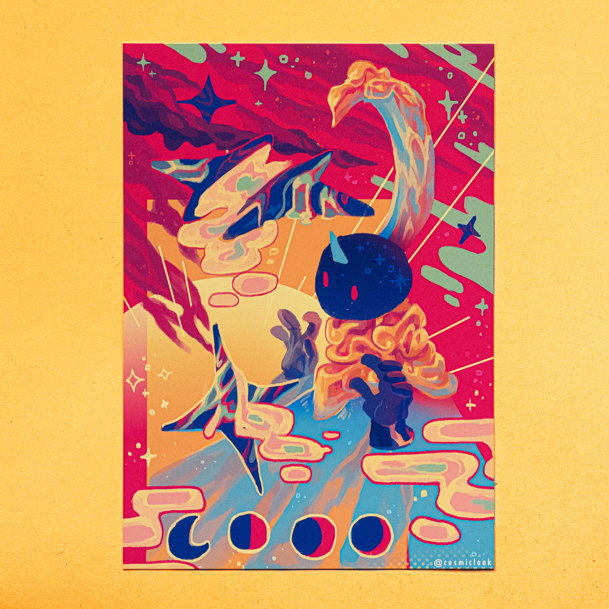 cosmicloak's objecthead character slicing stars and moons to collect astral nectar. Printed on Satin 260gms paper.