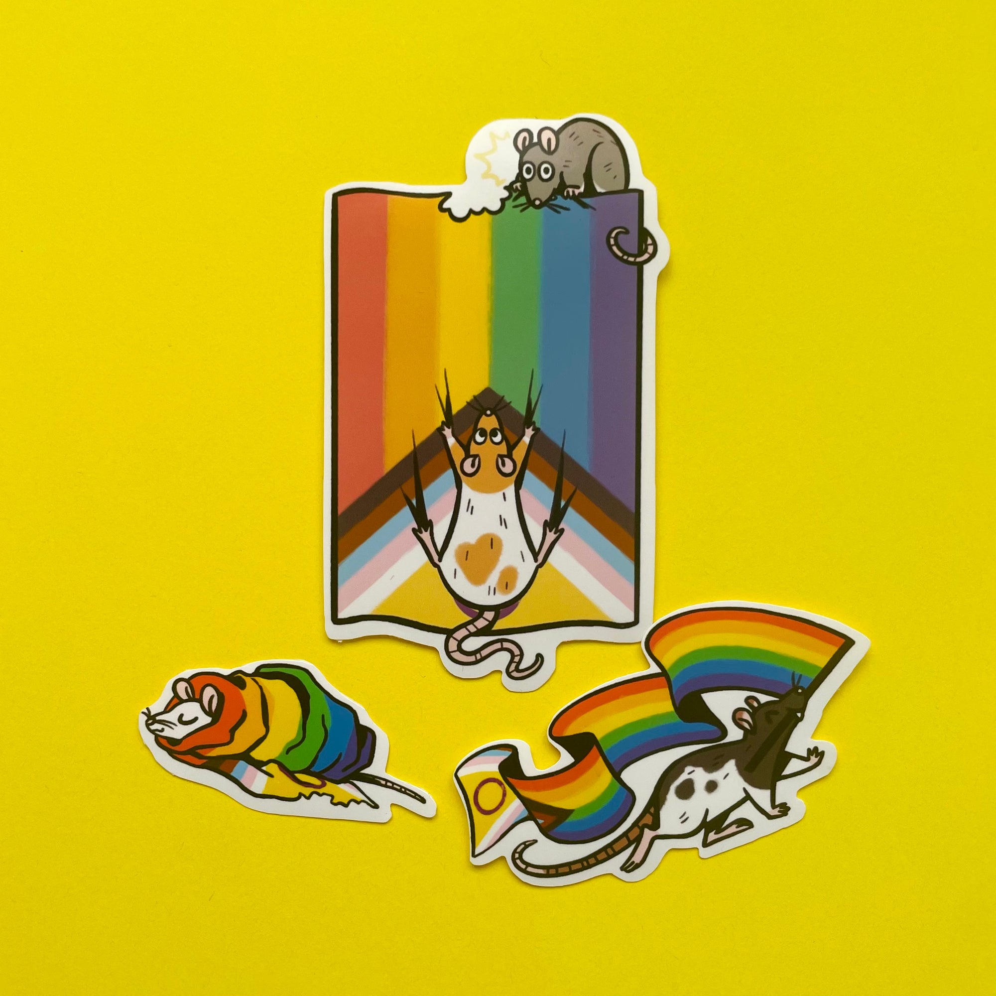 A set of three matching vinyl stickers featuring some happy little rats climbing on, carrying, and wrapped up in the LGBTQIA+ Pride flag of your choice!