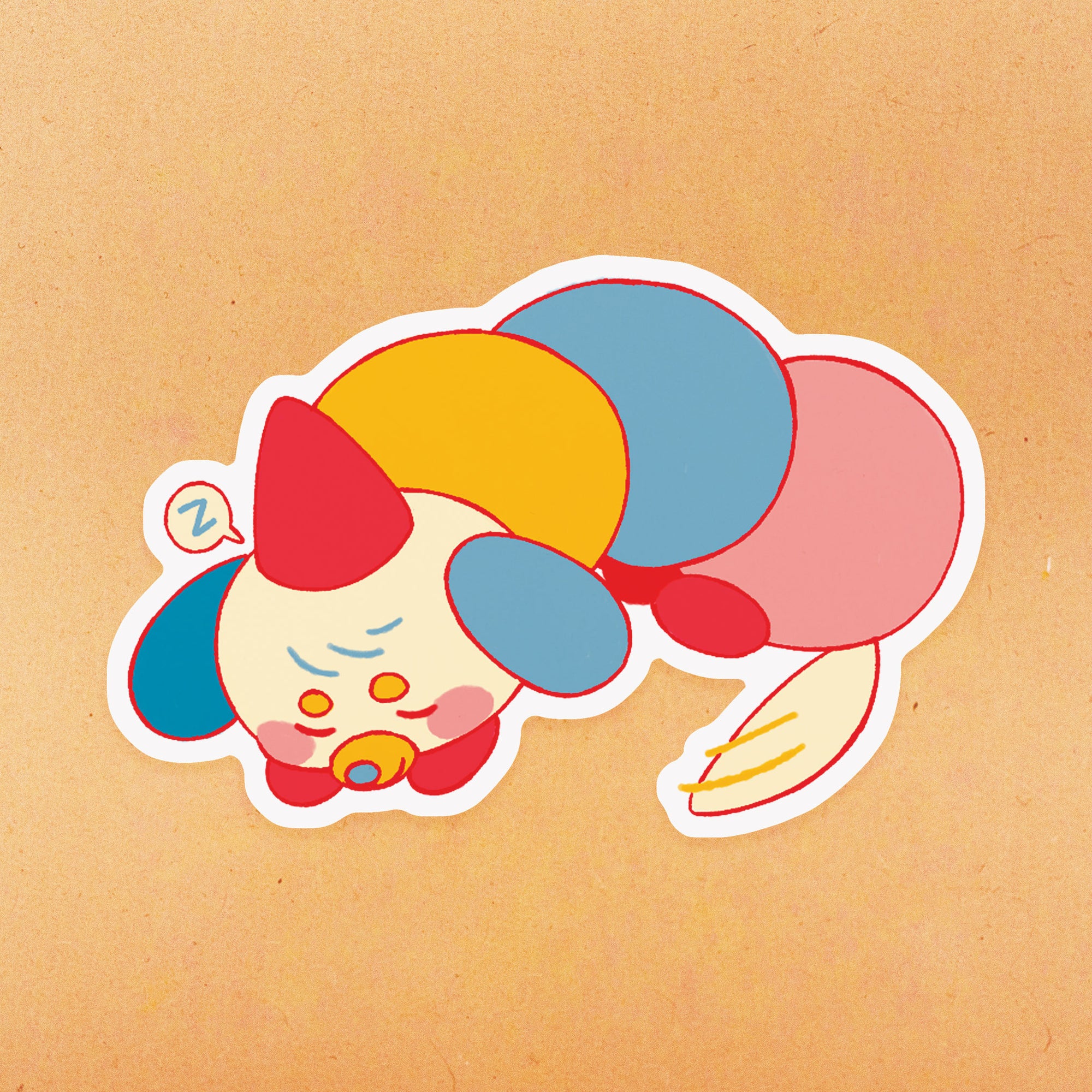 The adorable PupperPillar, perfect addition to any dog or bug lover's collection! This high-quality vinyl sticker features an sleepy pup transformed into a colorful caterpillar, complete with a funny hat and a smile.